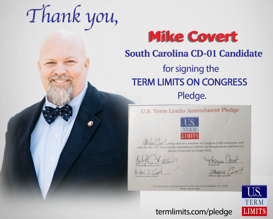 Washington, DC – U.S. Term Limits (USTL), the leader in the non-partisan national movement to limit terms for elected officials, praises Mike Covert, 2020 U.S. House candidate from South Carolina’s 1st congressional district, for signing the pledge for an amendment to term limit Congress. Previously, Nancy Mace, another candidate in the race, signed the term limits pledge. The incumbent, Democrat Joe Cunningham, is a cosponsor of HJR20, our U.S. House resolution to term limits Congress. The primary elections are scheduled for June 9, 2020.