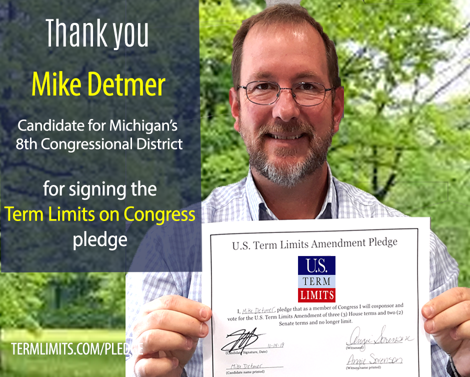 Washington, DC – U.S. Term Limits (USTL), the leader in the non-partisan national movement to limit terms for elected officials, praises, 2020 U.S. House candidate for Michigan (district 8), Mike Detmer, for signing the pledge for an amendment to term limit Congress. Detmer is the first signer in this race. The primary election is scheduled for August 4, 2020.