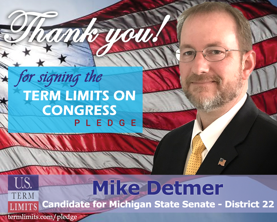 Detroit, MI – U.S. Term Limits (USTL), the leader in the national, non-partisan movement to limit terms for elected officials, is gathering support from state lawmakers across the nation. Its mission is to get 34 states to apply for an amendment proposal convention specific to term limits on Congress. Michigan state senate candidate, Mike Detmer (district 22), has  committed support for term limits on Congress by signing the U.S. Term Limits pledge. Detmer is the first signer in this race.