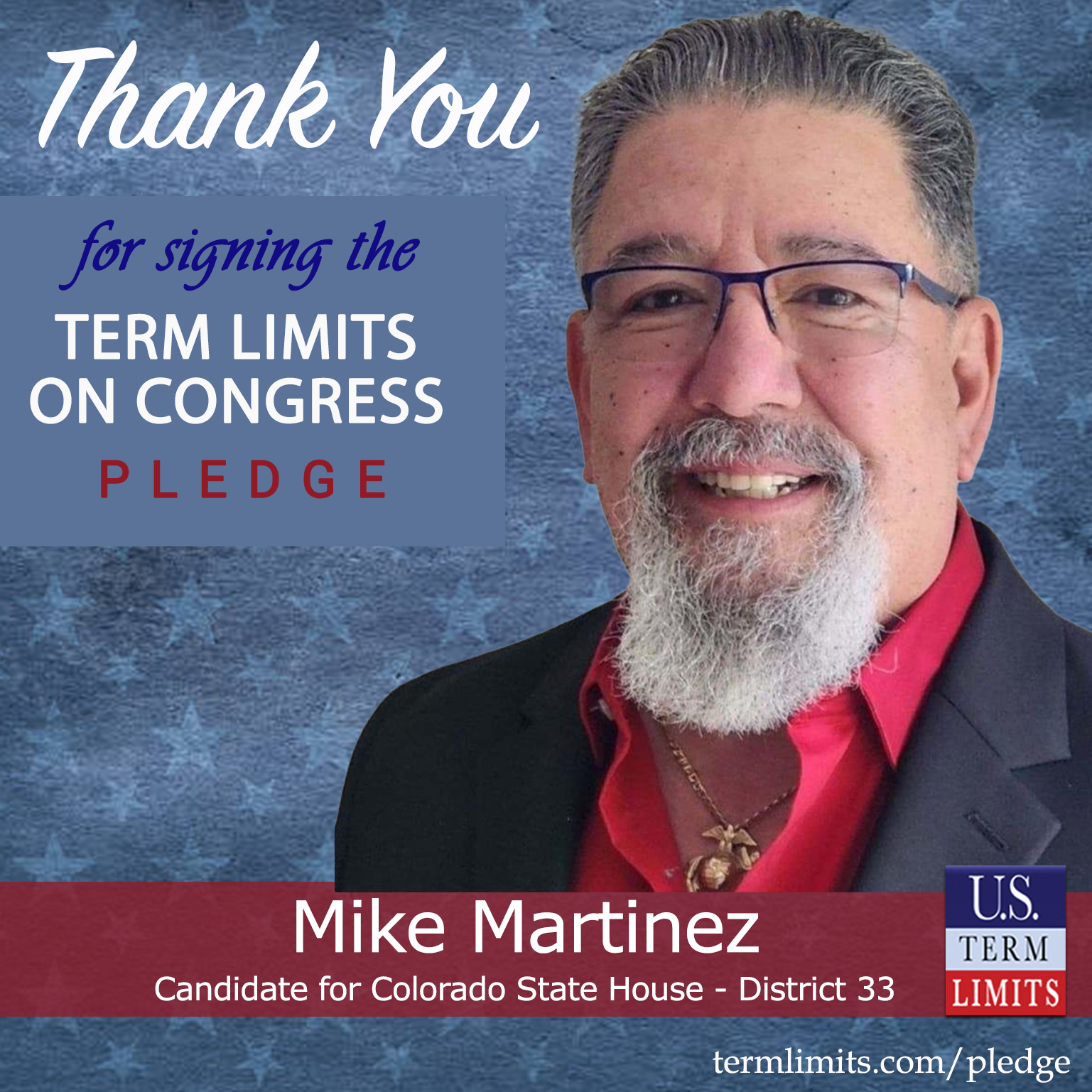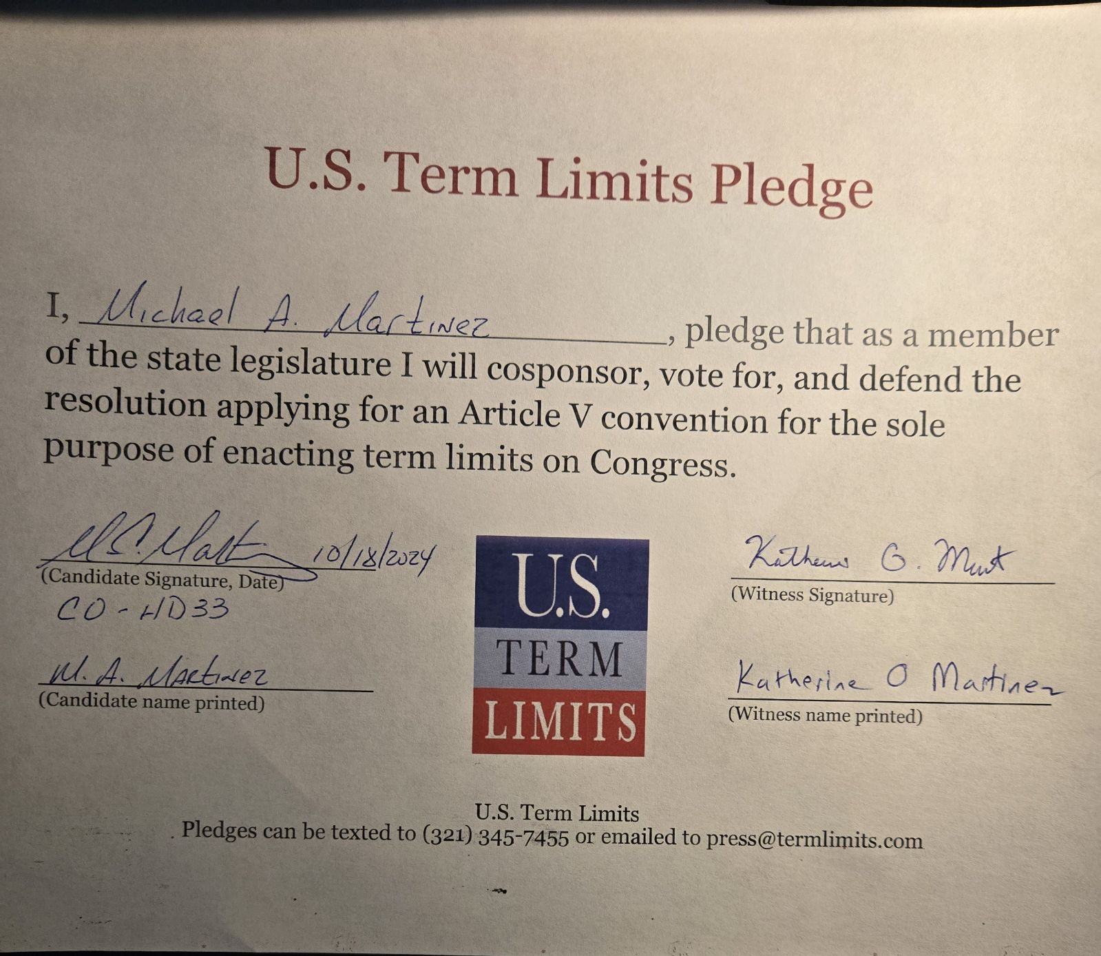 Broomfield, CO – U.S. Term Limits (USTL), the leader in the national, non-partisan movement to limit terms for elected officials, is gathering support from state lawmakers across the nation. Its mission is to get 34 states to apply for an amendment proposal convention specific to term limits on Congress. Colorado state house candidate, Mike Martinez (district 33), has committed support for term limits on Congress by signing the term limits convention pledge.