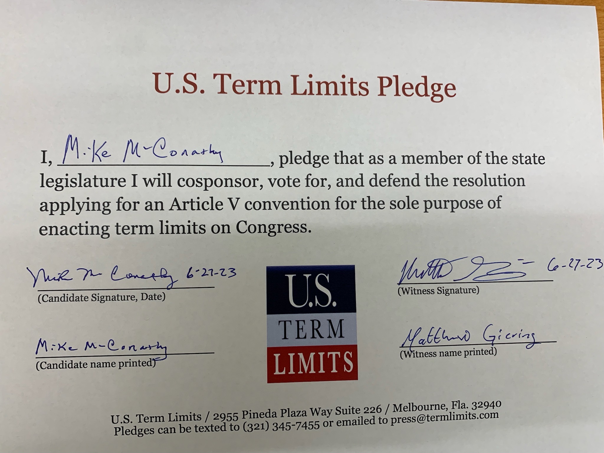 The U.S. Term Limits pledge is provided to candidates and members of state legislatures. It reads, “I pledge that, as a member of the state legislature, I will cosponsor, vote for, and defend the resolution applying for an Article V convention for the limited purpose of enacting term limits on Congress.”