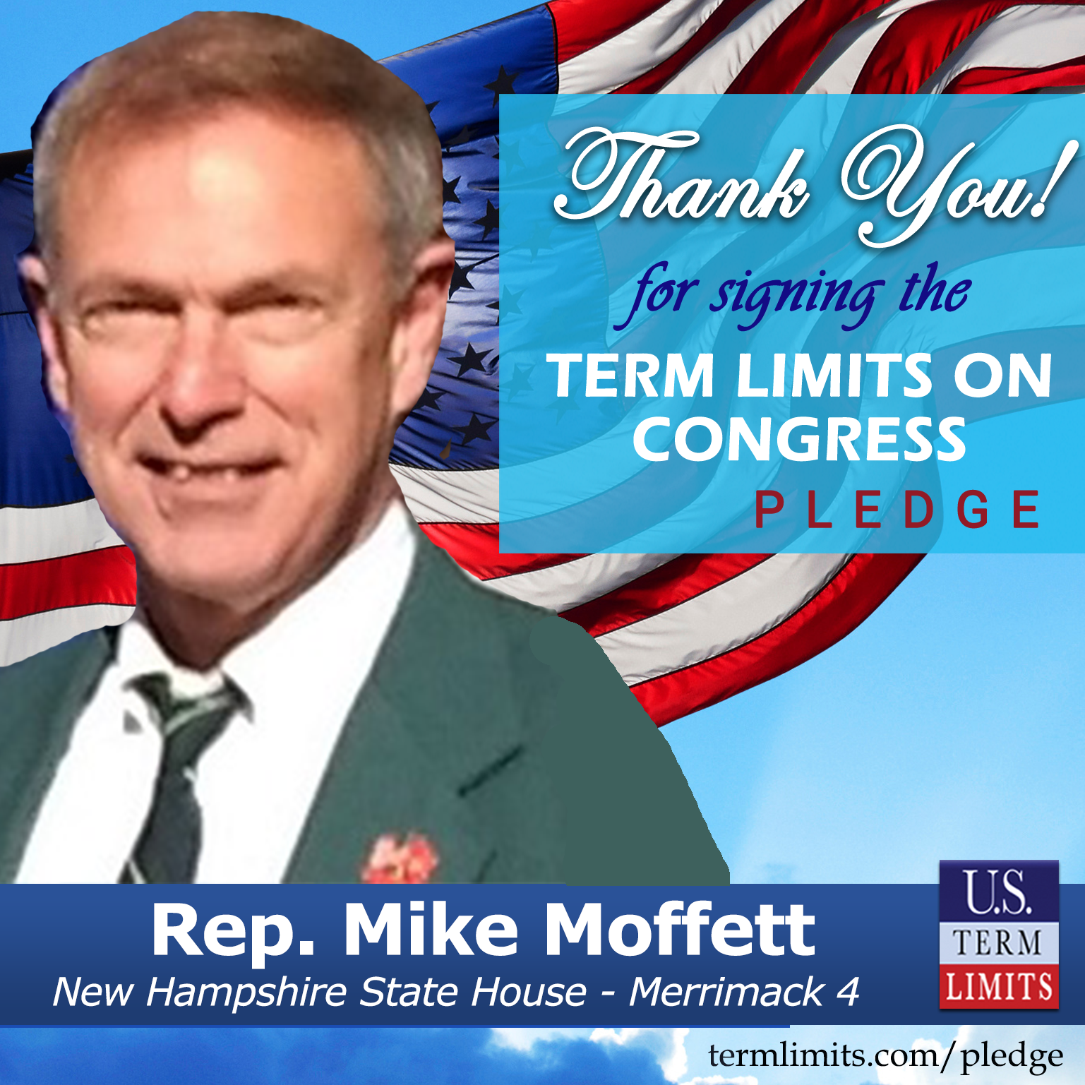 Loudon, NH – U.S. Term Limits (USTL), the leader in the national, non-partisan movement to limit terms for elected officials, is gathering support from state lawmakers across the nation. Its mission is to get 34 states to apply for an amendment proposal convention specific to term limits on Congress. New Hampshire state house Rep. Mike Moffett (Merrimack 04), has committed support for term limits on Congress by signing the term limits convention pledge.