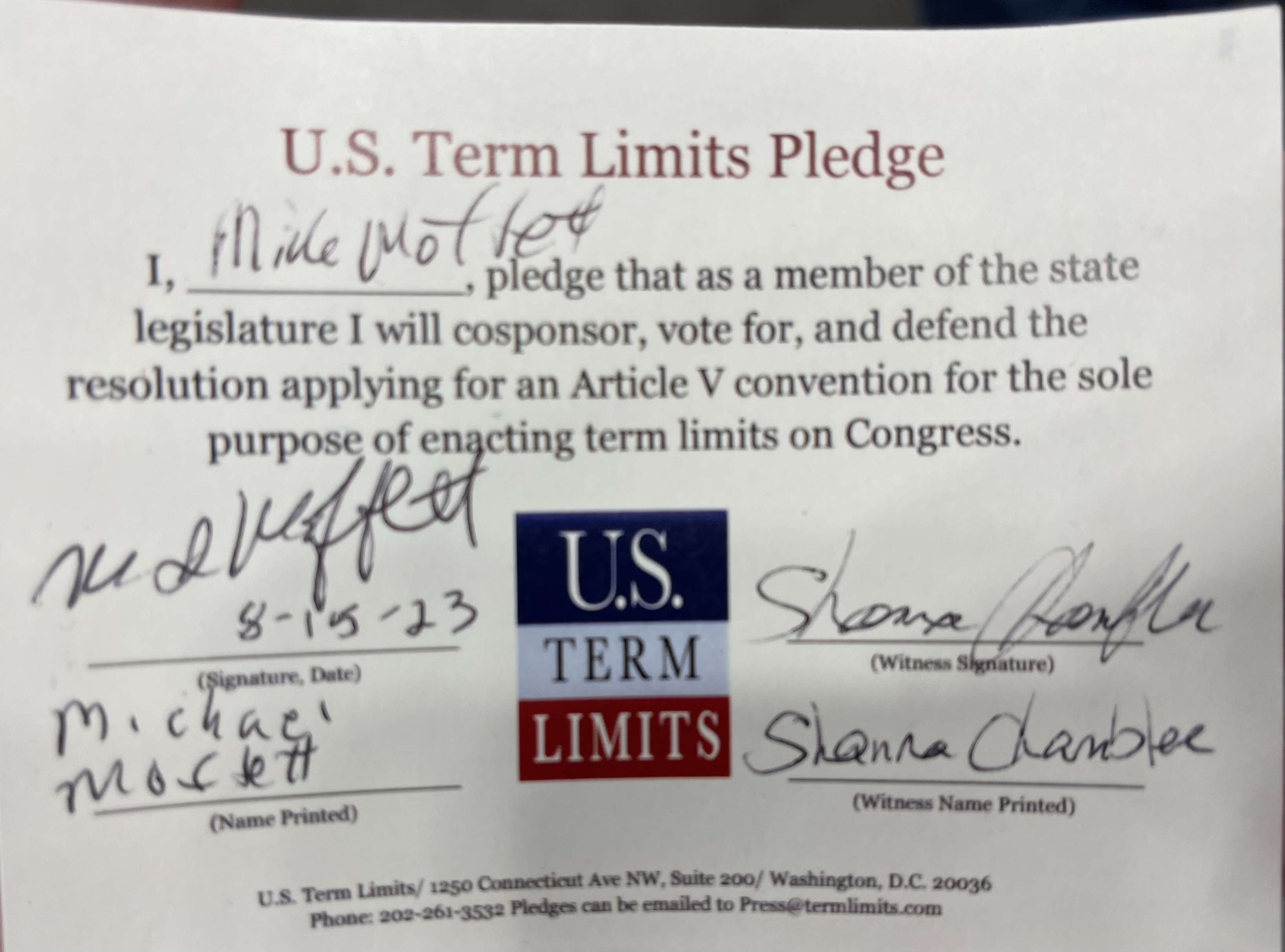 Rep. Mike Moffett Pledges to Support Congressional Term Limits