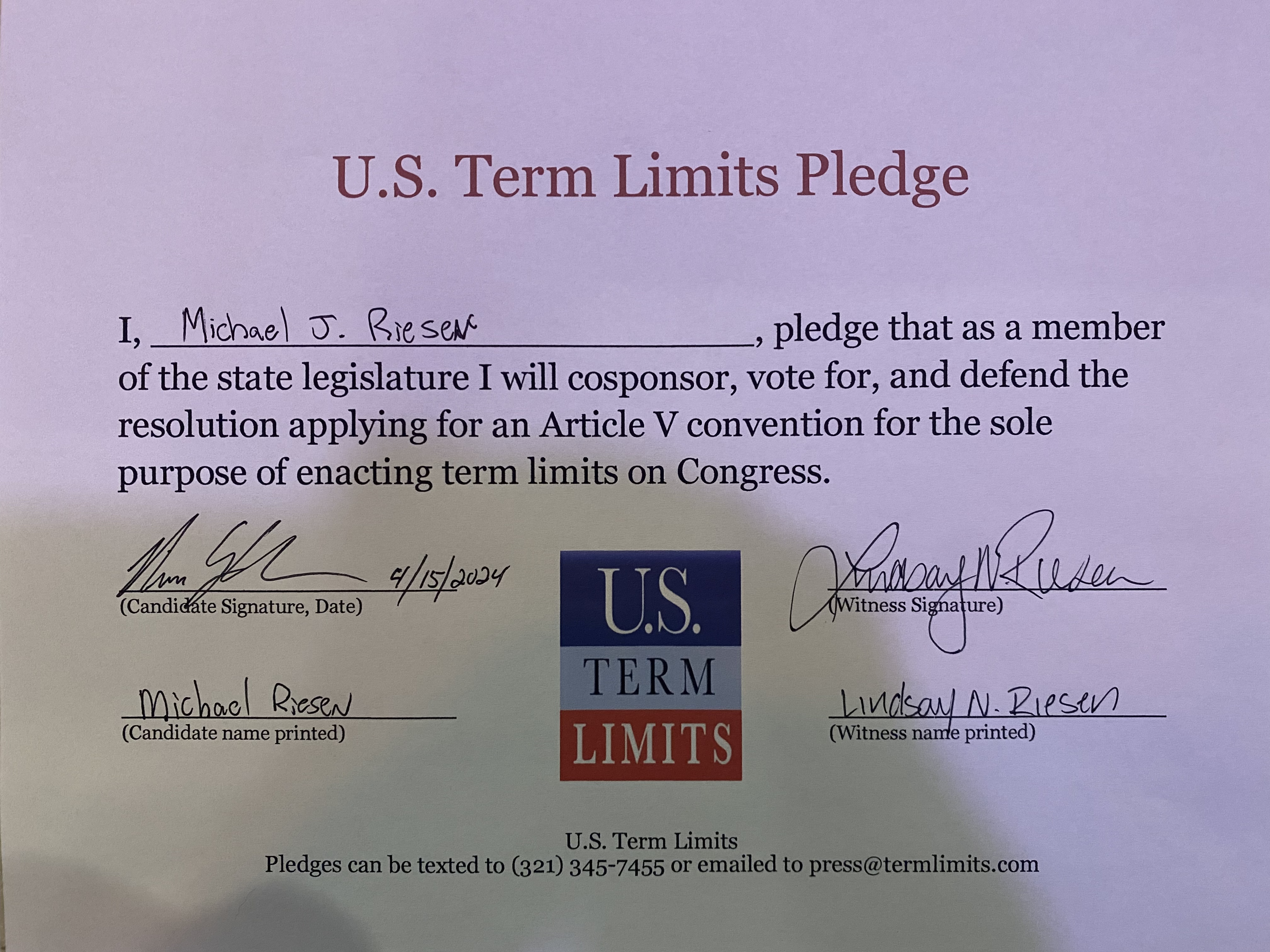 USTL President, Philip Blumel, commented on Riesen’s pledge saying, “Mike’s strong support of term limits shows that there are individuals who are willing to listen to the majority of voters who want term limits. America needs a Congress that will be served by citizen legislators, not career politicians.”