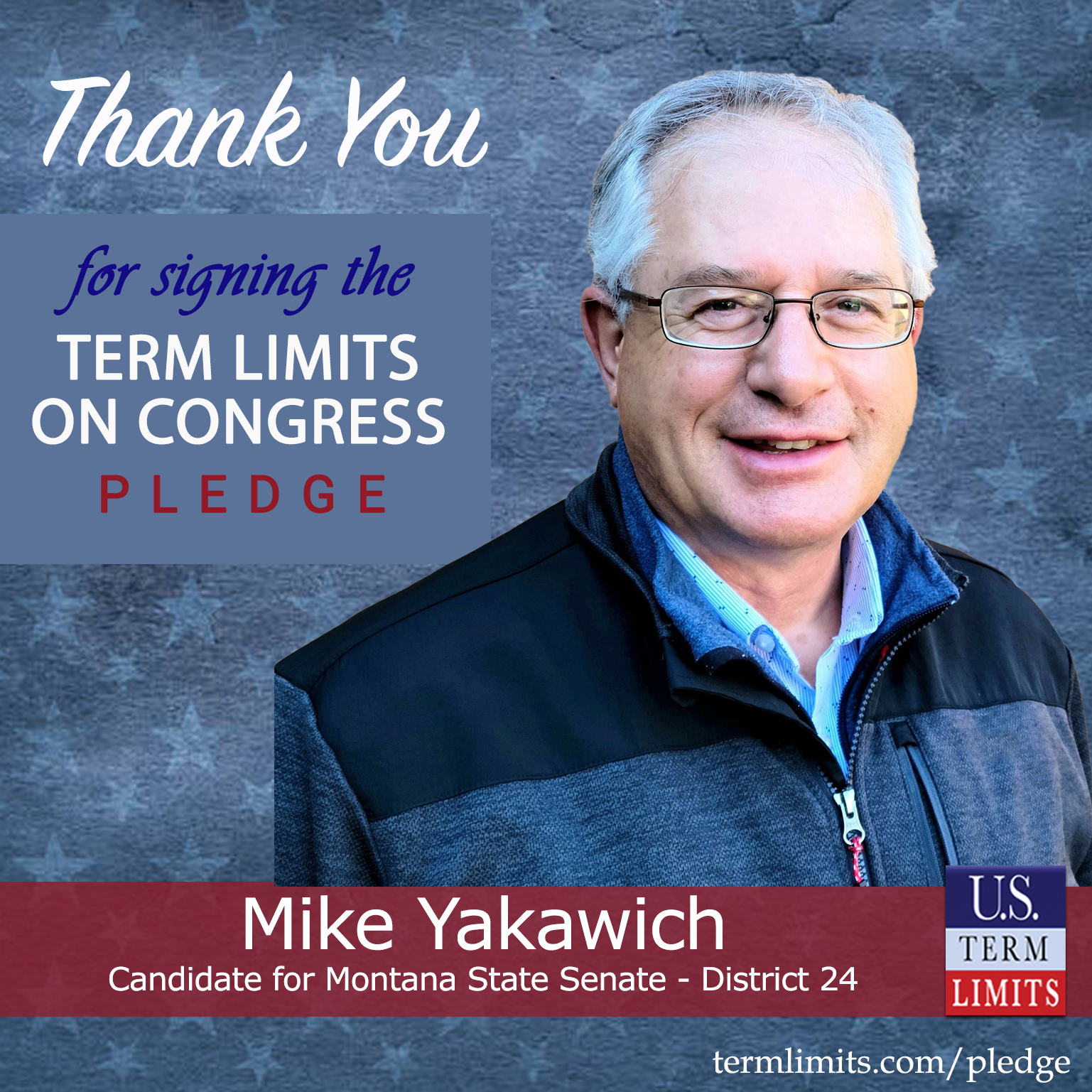Montana state chair for U.S. Term Limits, Ed Walker, commented on Yakawich’s pledge saying, “Term limits is critical for the future of our country. I am glad Mike has signed the pledge in supporting term limits on Congress. It shows that he understands the importance of the vision of our founding fathers and fixing DC. “