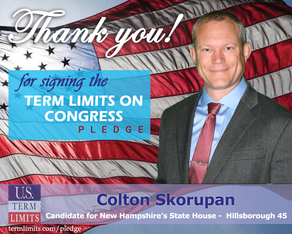 The U.S. Term Limits pledge is provided to candidates and members of state legislatures. It reads, “I pledge that, as a member of the state legislature, I will cosponsor, vote for, and defend the resolution applying for an Article V convention for the limited purpose of enacting term limits on Congress.”