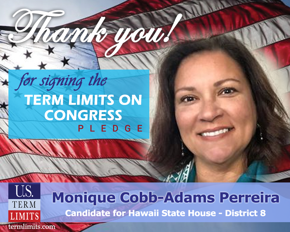 Honolulu, HI– U.S. Term Limits (USTL), the leader in the national, non-partisan movement to limit terms for elected officials, is gathering support from state lawmakers across the nation. Its mission is to get 34 states to apply for an amendment proposal convention specific to term limits on Congress. Hawaii state house candidate, Monique Perreira (district 8), has committed support for term limits on Congress by signing the U.S. Term Limits pledge. Perreira is the first signer in this race.