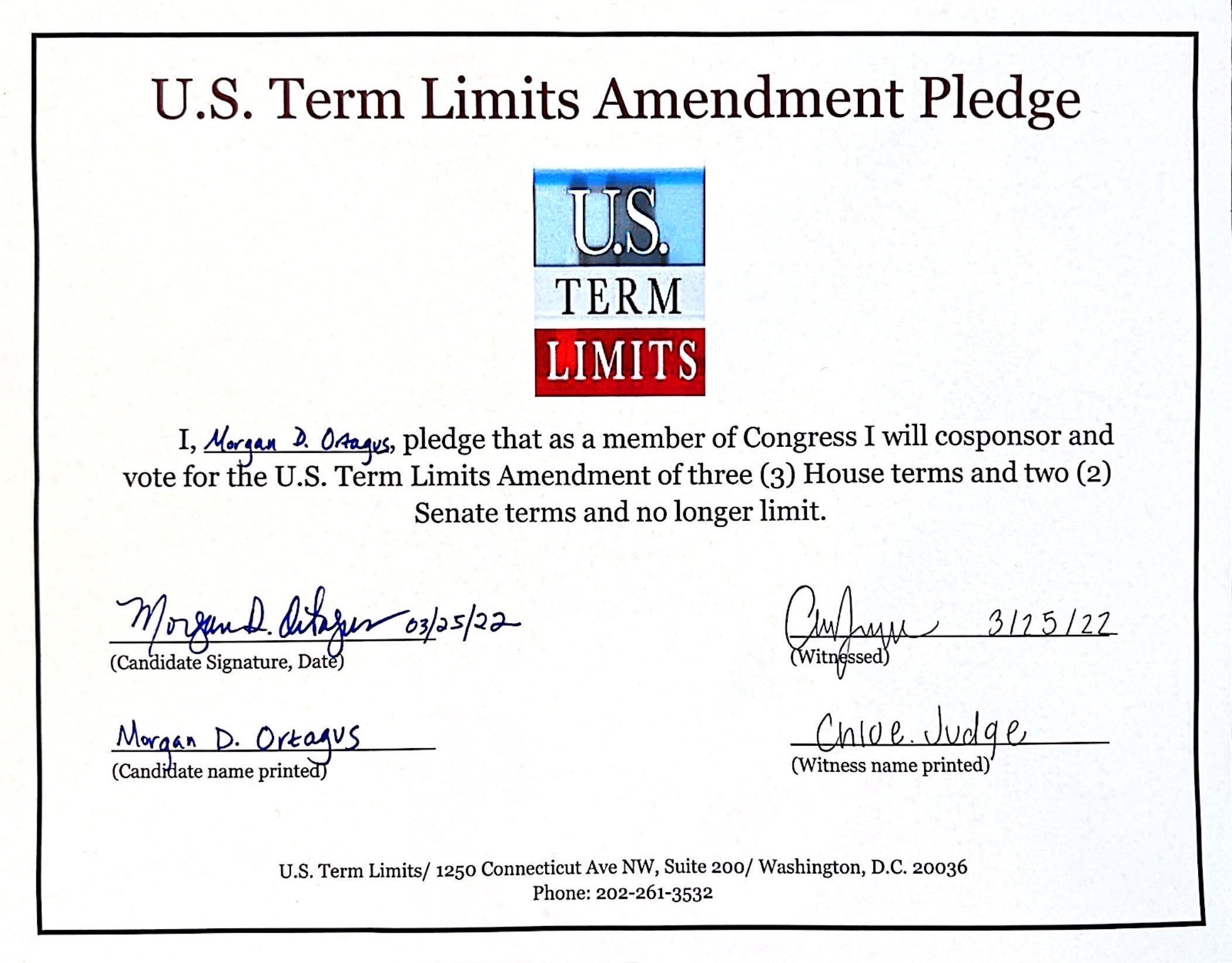 Washington D.C. – U.S. Term Limits (USTL), the leader in the non-partisan national movement to limit terms for elected officials, praises 2022 U.S. house candidate for Tennessee, Morgan Ortagus (district 5), for signing the pledge for an amendment to term limit Congress. Previously, candidates Kurt Winstead, Robby Starbuck and Rick Shannon also signed the pledge.