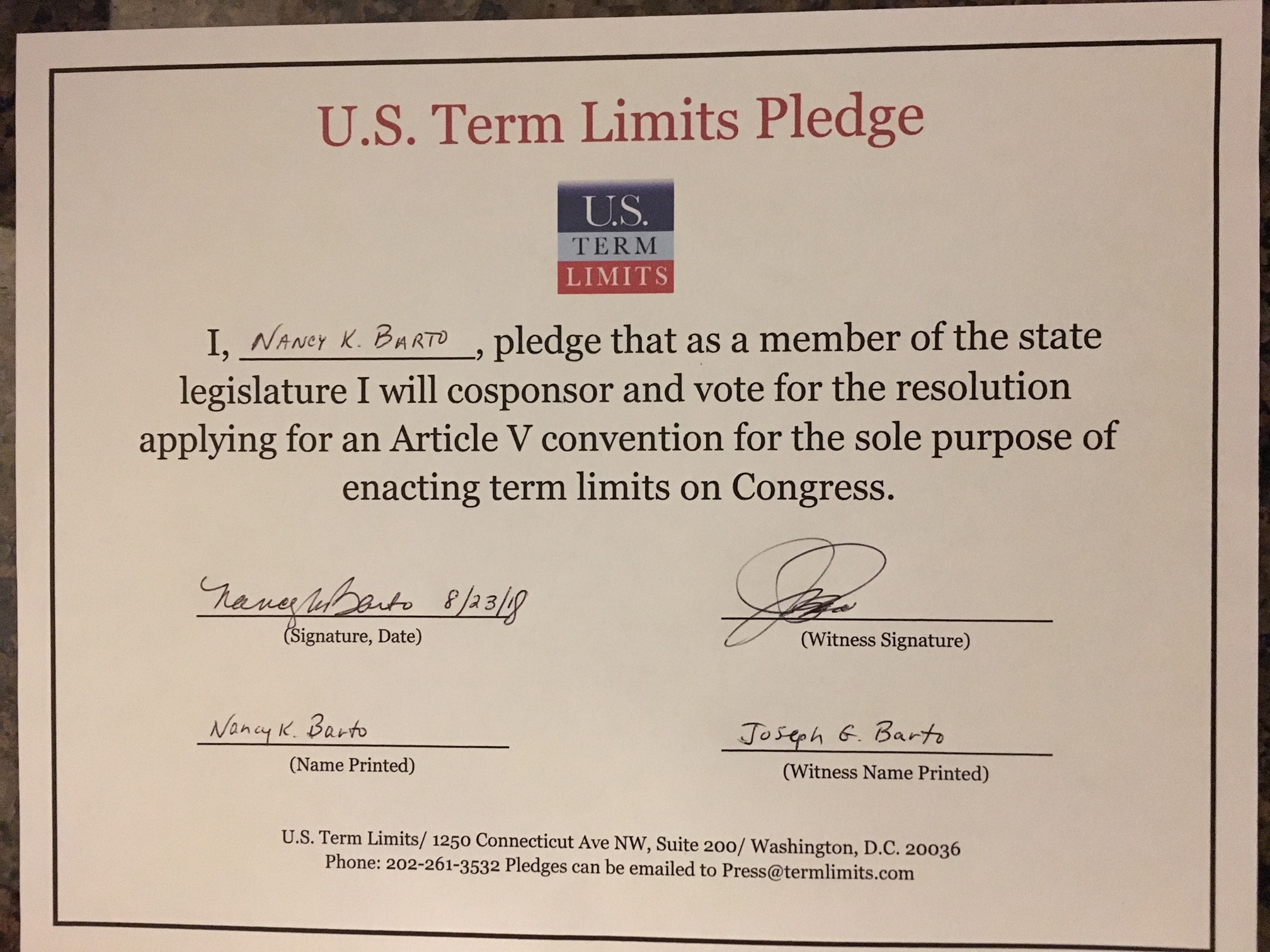 USTL President, Philip Blumel, commented on Barto’s pledge saying, “Nancy’s support of term limits shows that there are individuals who are willing to listen to the majority of voters who want term limits. America needs a Congress that will be served by citizen legislators, not career politicians.”