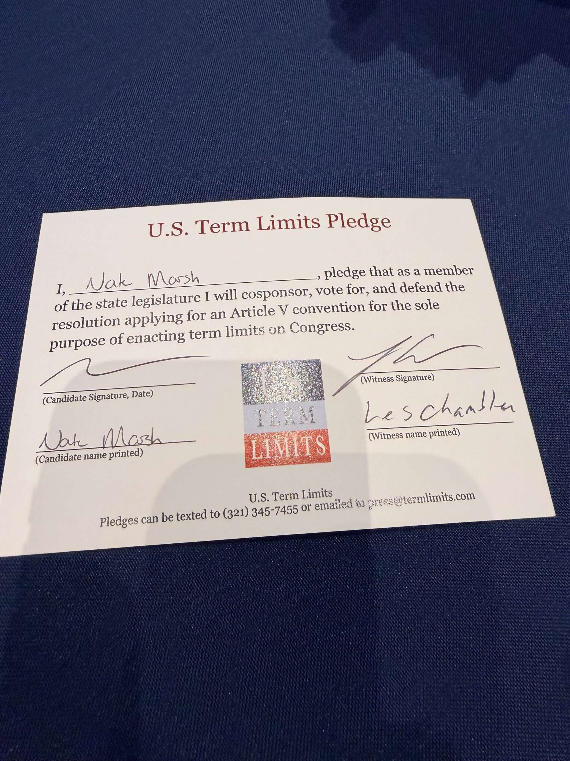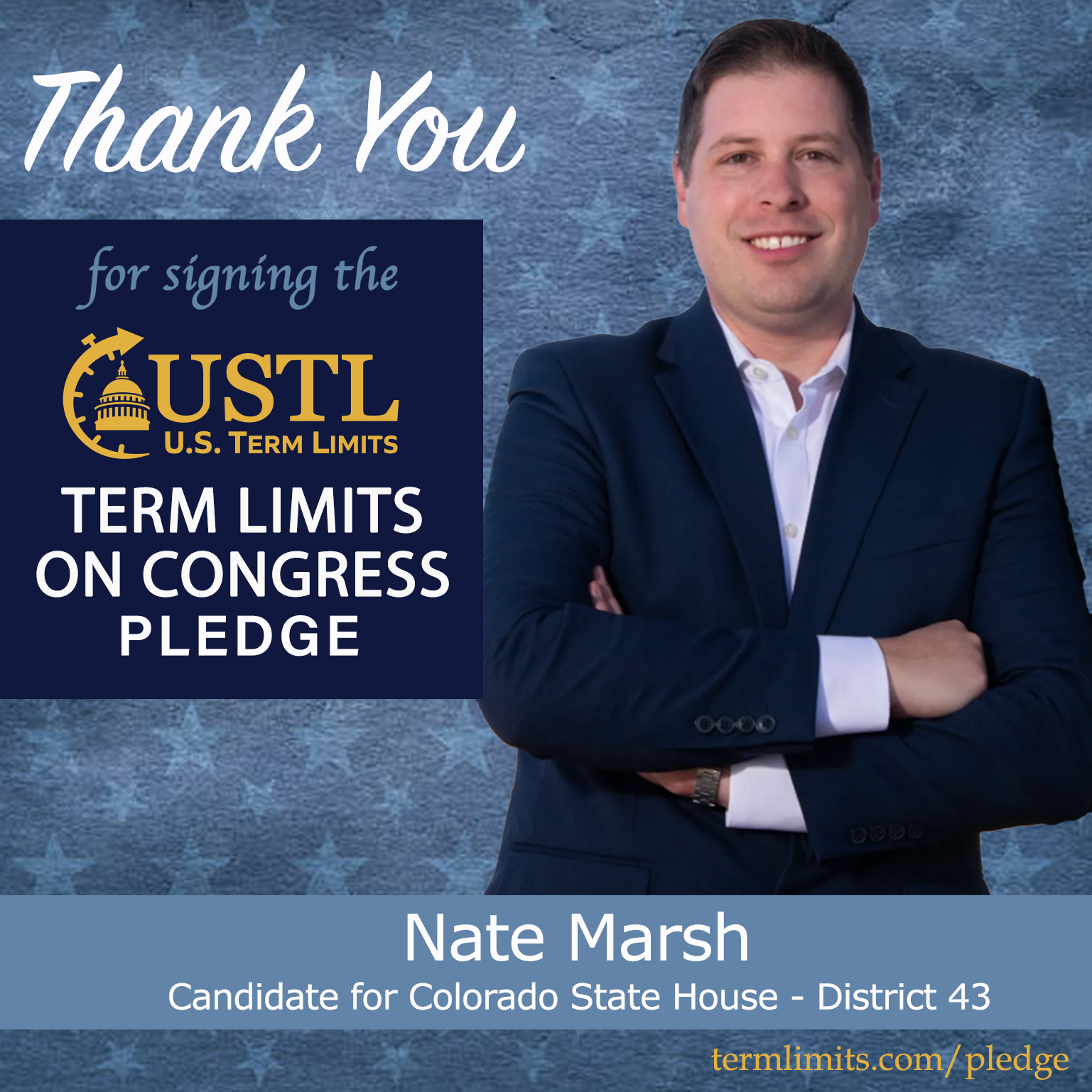 Highlands Ranch, CO – U.S. Term Limits (USTL), the leader in the national, non-partisan movement to limit terms for elected officials, is gathering support from state lawmakers across the nation. Its mission is to get 34 states to apply for an amendment proposal convention specific to term limits on Congress. Colorado state house candidate, Nate Marsh (district 43), has committed support for term limits on Congress by signing the term limits convention pledge.
