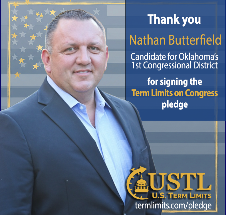 Washington D.C. – U.S. Term Limits (USTL), the leader in the non-partisan national movement to limit terms for elected officials, praises 2026 U.S. Representative candidate for Oklahoma, Nathan Butterfield (district 1), for signing the pledge for an amendment to term limit Congress. Previously, candidates Kelly Walsh, Jed Cochran, Nancy Dyson, Kim David, John Croisant, Mark Tedford and Jackson Lahmeyer also signed.