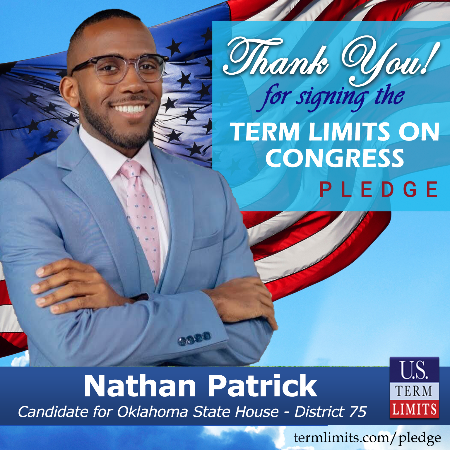 Stonegate, OK – U.S. Term Limits (USTL), the leader in the national, non-partisan movement to limit terms for elected officials, is gathering support from state lawmakers across the nation. Its mission is to get 34 states to apply for an amendment proposal convention specific to term limits on Congress.  Oklahoma state house candidate, Nathan Patrick (district 75), has committed support for term limits on Congress by signing the Term Limits Convention Pledge. Patrick is the first signer in this race.