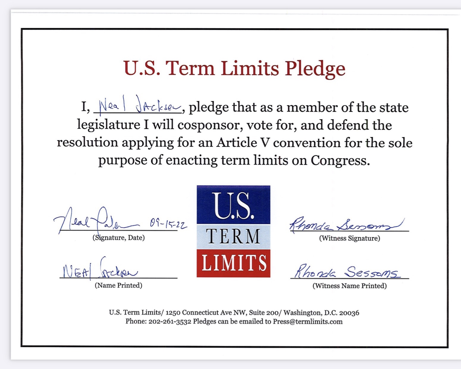 Neal Jackson Pledges to Support Congressional Term Limits
