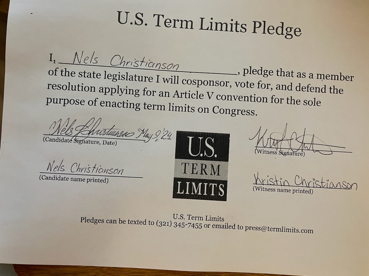 Nels Christianson Pledges to Support Congressional Term Limits