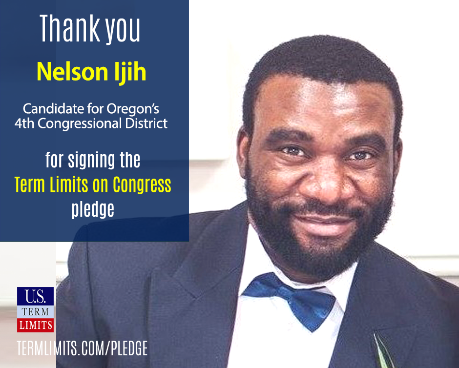 Washington, DC – U.S. Term Limits (USTL), the leader in the non-partisan national movement to limit terms for elected officials, praises 2020 U.S. house candidate for Oregon (district 4), Nelson Ijih, for signing the pledge for an amendment to term limit Congress. Nelson is the first signer in this race. The OR CD-04 election is scheduled for May 19, 2020.