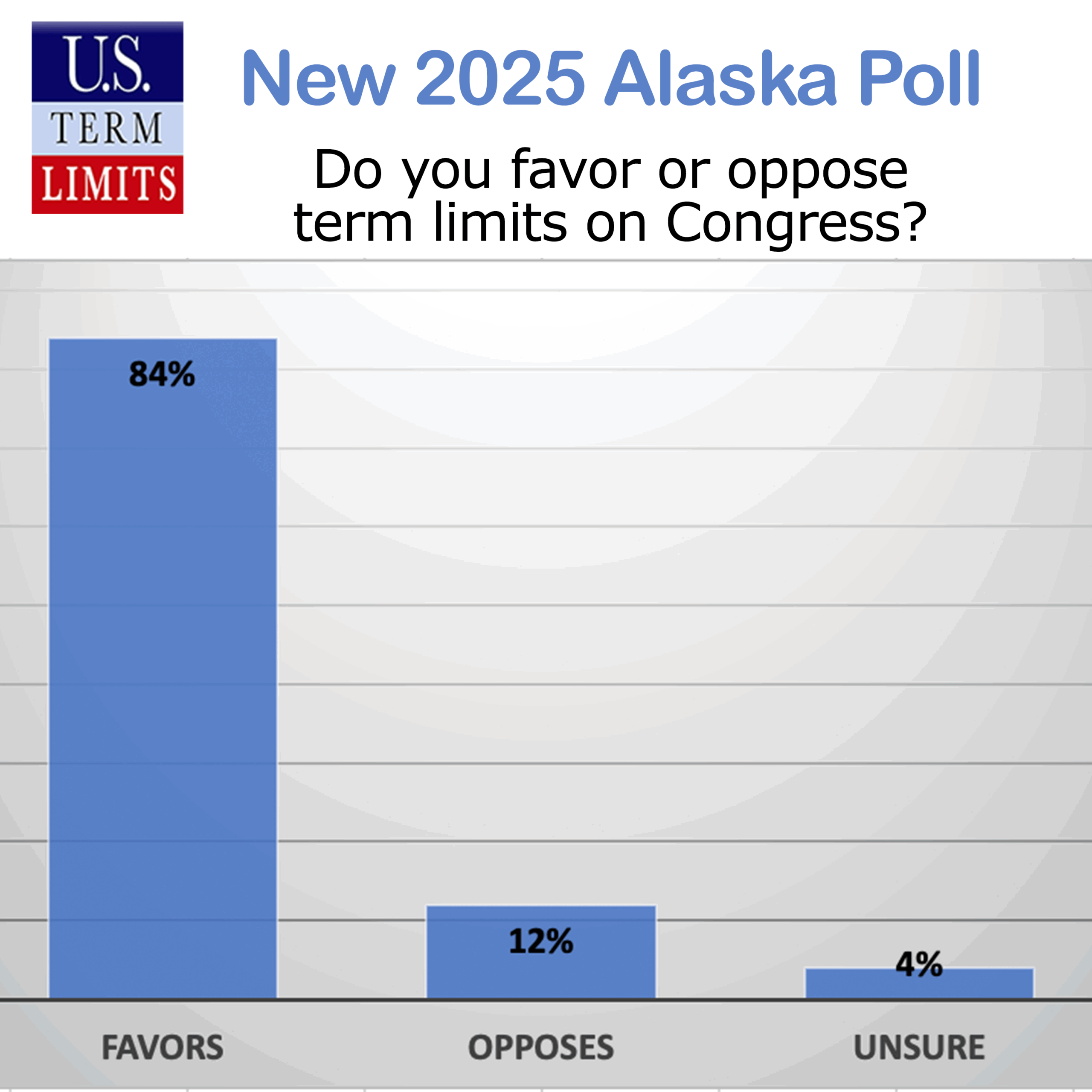Anchorage, AK – A new poll of registered Alaska voters conducted by RMG Research on January 2-8, 2025 found an overwhelming 84% favor term limits for Congress. This reflects sentiments in favor of congressional term limits in other states as well. The poll showed that 75% of Alaskans would want their state senator and state representative to favor legislation calling for a convention to propose congressional term limits.
