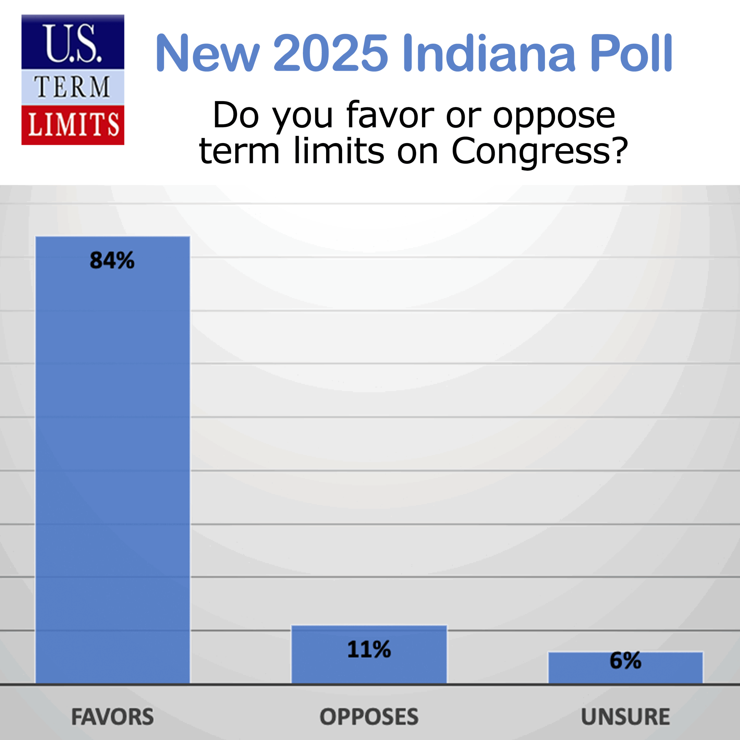 Indianapolis, IN – A new poll of registered Indiana voters, conducted by RMG Research on January 2-6, 2025, found an overwhelming 84% favor term limits for Congress. This reflects sentiments in favor of congressional term limits in other states as well. The poll showed that 82% of Hoosiers would want their state senator and state representative to favor legislation calling for a convention to propose congressional term limits.