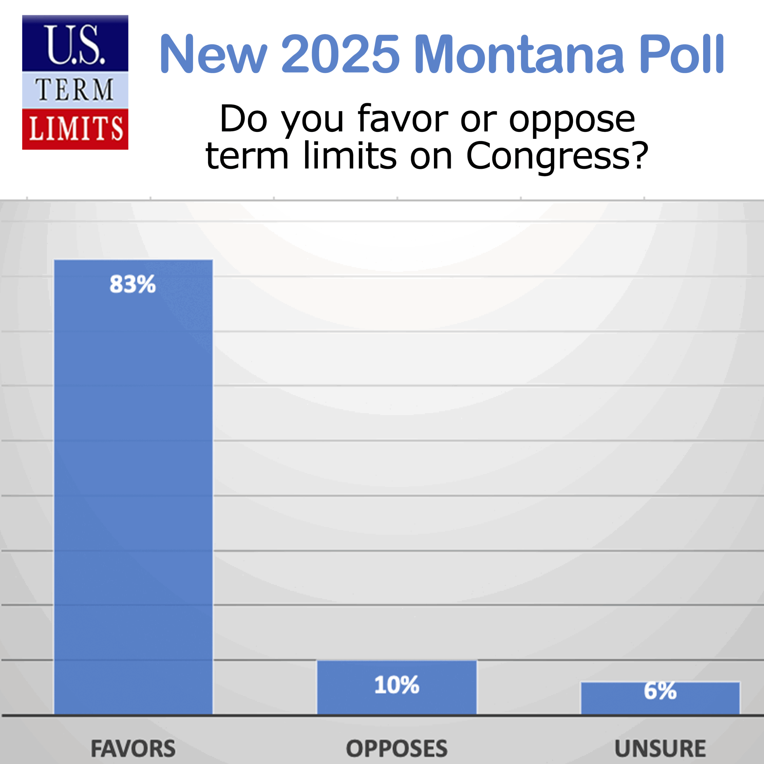 Helena, MT – A new poll of registered Montana voters conducted by RMG Research on January 2-8, 2025 found an overwhelming 83% favor term limits for Congress. This reflects sentiments in favor of congressional term limits in other states as well. The poll showed that 74% of Montanans would want their state senator and state representative to favor legislation calling for a convention to propose congressional term limits.