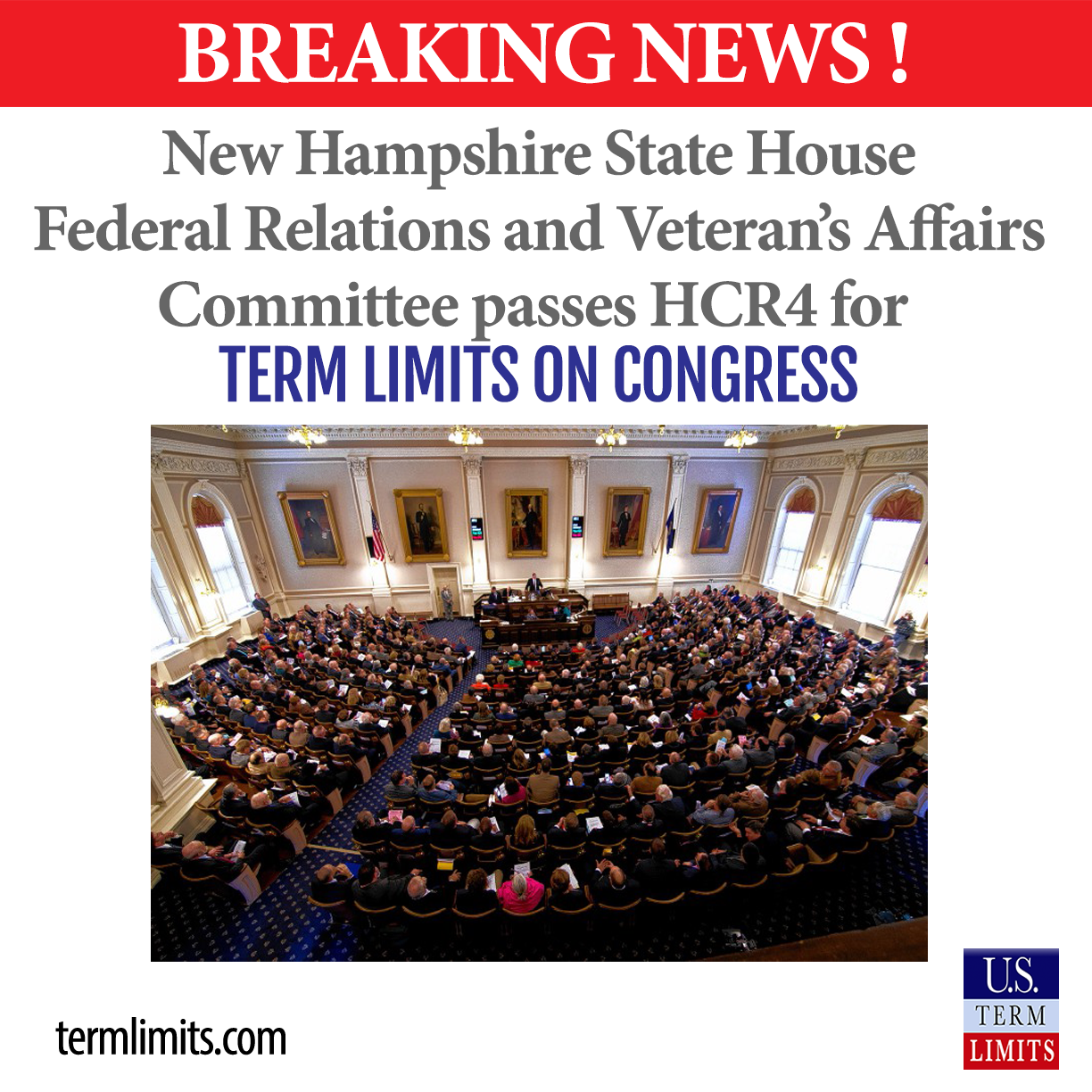 Concord, NH – The New Hampshire House on Federal Relations and Veteran’s Affairs Committee just voted “ought to pass” on a resolution calling for the states to propose a congressional term limits amendment to the U.S. Constitution. House Concurrent Resolution 4 (HCR4), led by Representative Scott Wallace, passed by a vote of 11 to 6. The effort is being spearheaded by the nonpartisan, nonprofit U.S. Term Limits.
