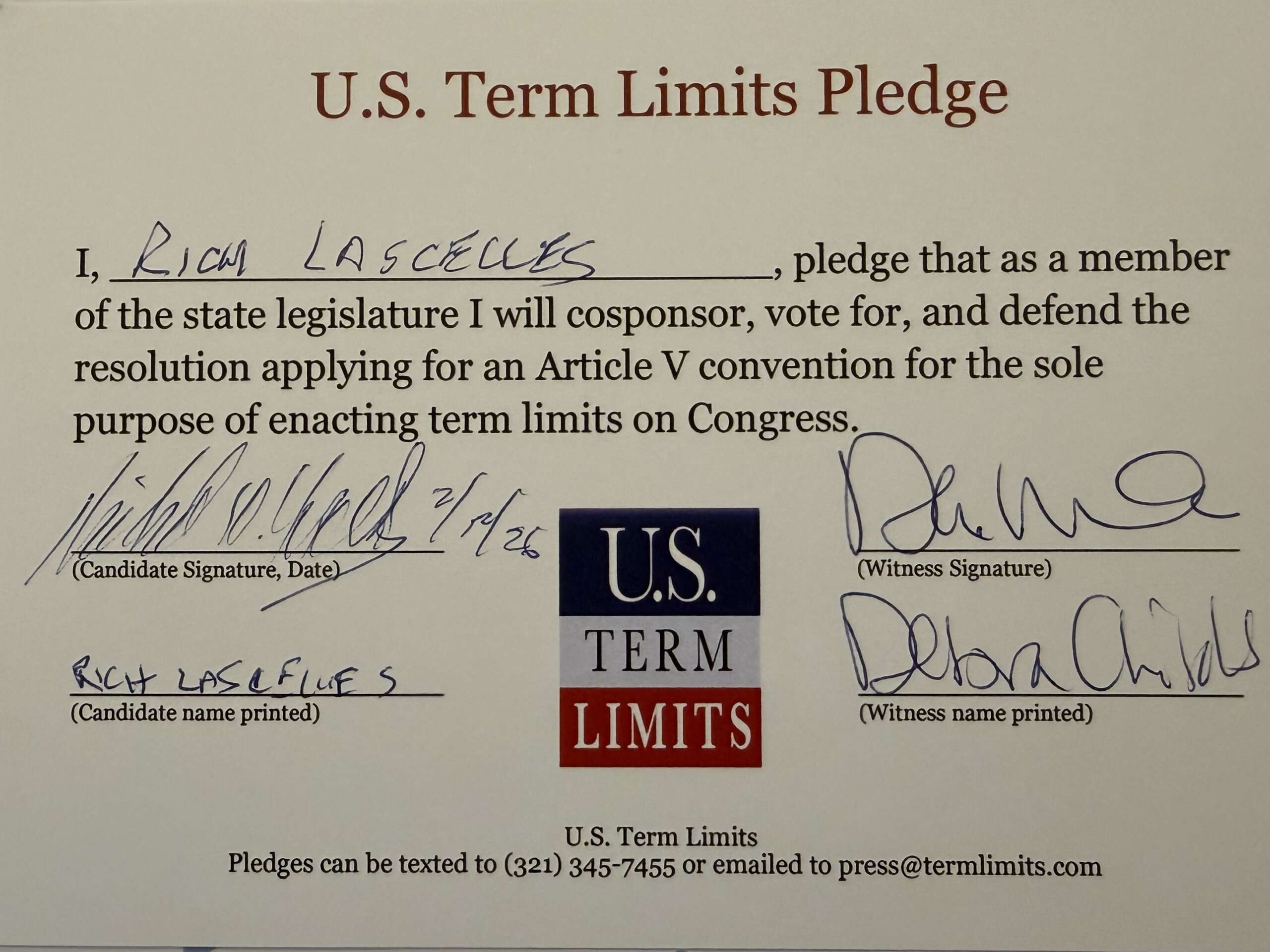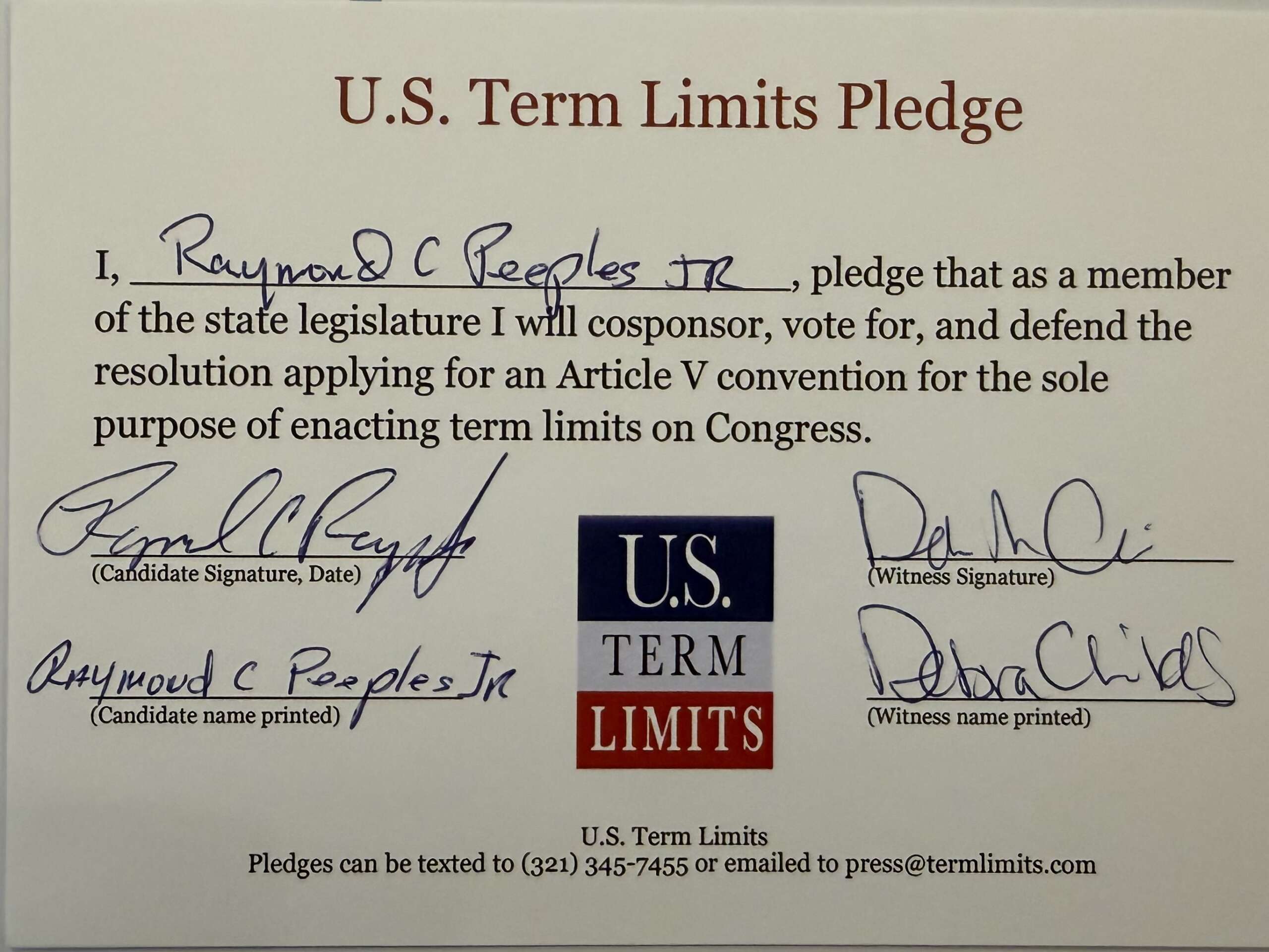 The U.S. Term Limits pledge is provided to candidates and members of state legislatures. It reads, “I pledge that, as a member of the state legislature, I will cosponsor, vote for, and defend the resolution applying for an Article V convention for the sole purpose of enacting term limits on Congress.”