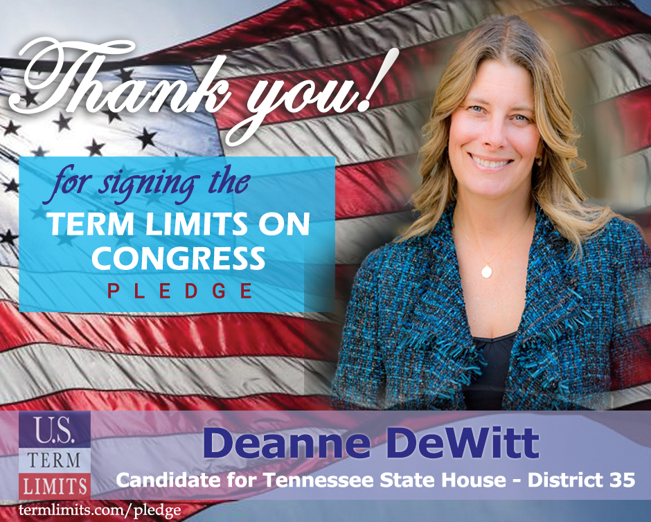 The U.S. Term Limits amendment pledge is provided to every announced candidate for federal office. It reads, “I pledge that as a member of Congress, I will cosponsor and vote for the U.S. Term Limits amendment of three (3) two-year House terms and two (2) six-year Senate terms and no longer limit.”