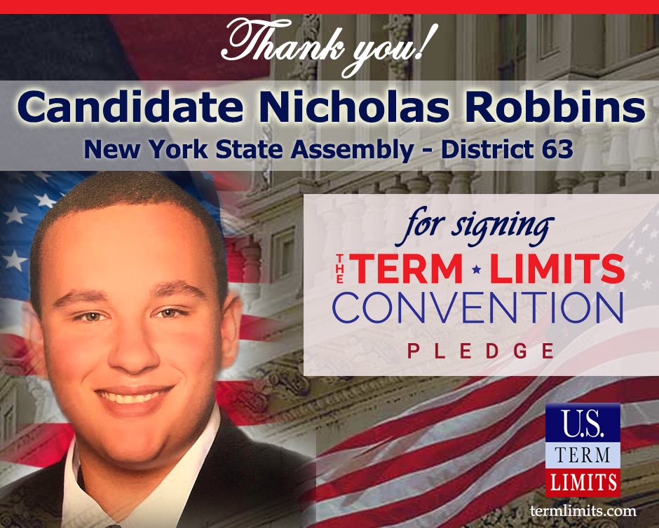 Washington, D.C. – U.S. Term Limits (USTL), the leader in the national, non-partisan movement to limit terms for elected officials, is gathering support from state lawmakers across the nation. Its mission is to get 34 states to apply for an amendment proposal convention specific to term limits on Congress. 2020 New York state assembly candidate, Nicholas Robbins, (district 63), has committed support for term limits on Congress by signing the Term Limits Convention pledge. The primary election is scheduled for June 23, 2020.