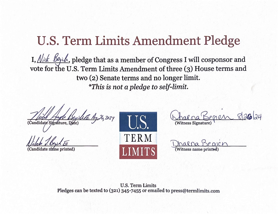 Washington D.C. – U.S. Term Limits (USTL), the leader in the non-partisan national movement to limit terms for elected officials, praises 2024 U.S. House candidate for Alaska, Nick Begich (At-Large District), for signing the pledge for an amendment to term limit Congress.