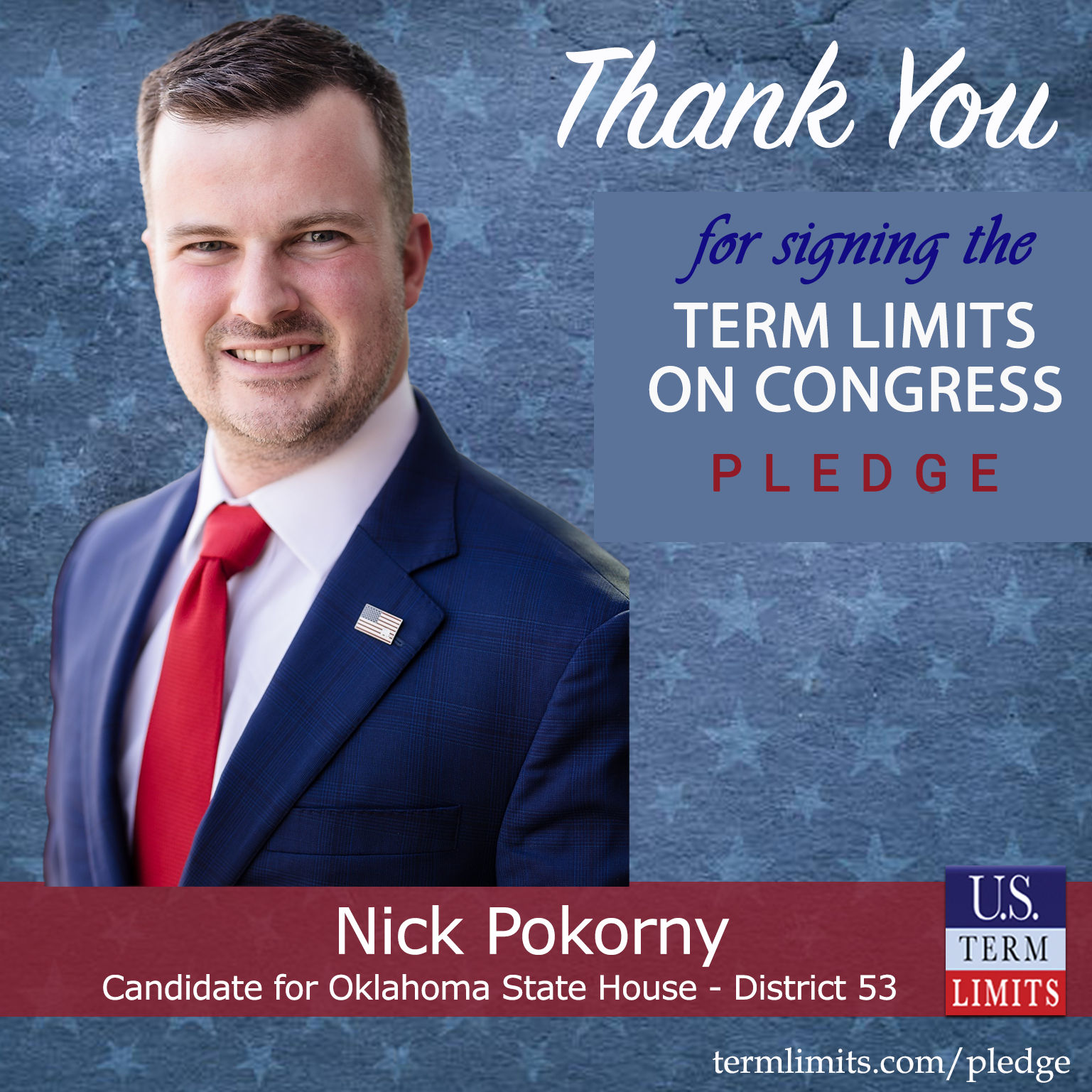USTL President, Philip Blumel, commented on Pokorny’s pledge saying, “Nick’s strong support of term limits shows that there are individuals who are willing to listen to the majority of voters who want term limits. America needs a Congress that will be served by citizen legislators, not career politicians.”