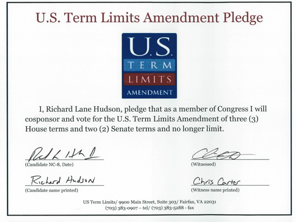 The U.S. Term Limits amendment pledge is provided to every announced candidate for federal office. It reads, “I pledge that as a member of Congress, I will cosponsor and vote for the U.S. Term Limits amendment of three (3) House terms and two (2) Senate terms and no longer limit.” The U.S. Term Limits constitutional amendment has been introduced in both the U.S. Senate by Senator Ted Cruz and his colleagues (SJR2) and the U.S. House by Representative Ralph Norman (HJR11).