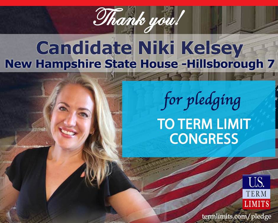 Washington, D.C. – U.S. Term Limits (USTL), the leader in the national, non-partisan movement to limit terms for elected officials, is gathering support from state lawmakers across the nation. Its mission is to get 34 states to apply for an amendment proposal convention specific to term limits on Congress. New Hampshire state house candidate, Niki Kelsey (Hillsborough 7), has committed support for term limits on Congress by signing the Term Limits Convention pledge. Previously, candidate Steve Kenda also signed the pledge.