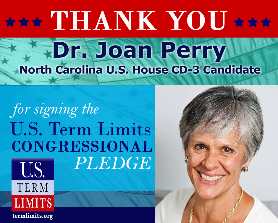 Washington, D.C. – U.S. Term Limits (USTL), the leader in the non-partisan national movement to limit terms for elected officials, praises North Carolina congressional district 03 candidate Dr. Joan Perry for signing its pledge to term limit Congress. Previously, eight other candidates: Tim Harris, Dana Outlaw, Phil Law, Jeff Moore, state representative Phil Shepard (HD-15), Gary Ceres, Chimer David Clark Jr. and Dr. Kevin Baiko, all signed the term limits pledge. The CD-03 seat was vacated by Rep. Walter Jones who died earlier this year. Primaries are scheduled for April 30, 2019, and primary runoffs are slated for July 9, 2019. The general election will be held September 10, 2019.