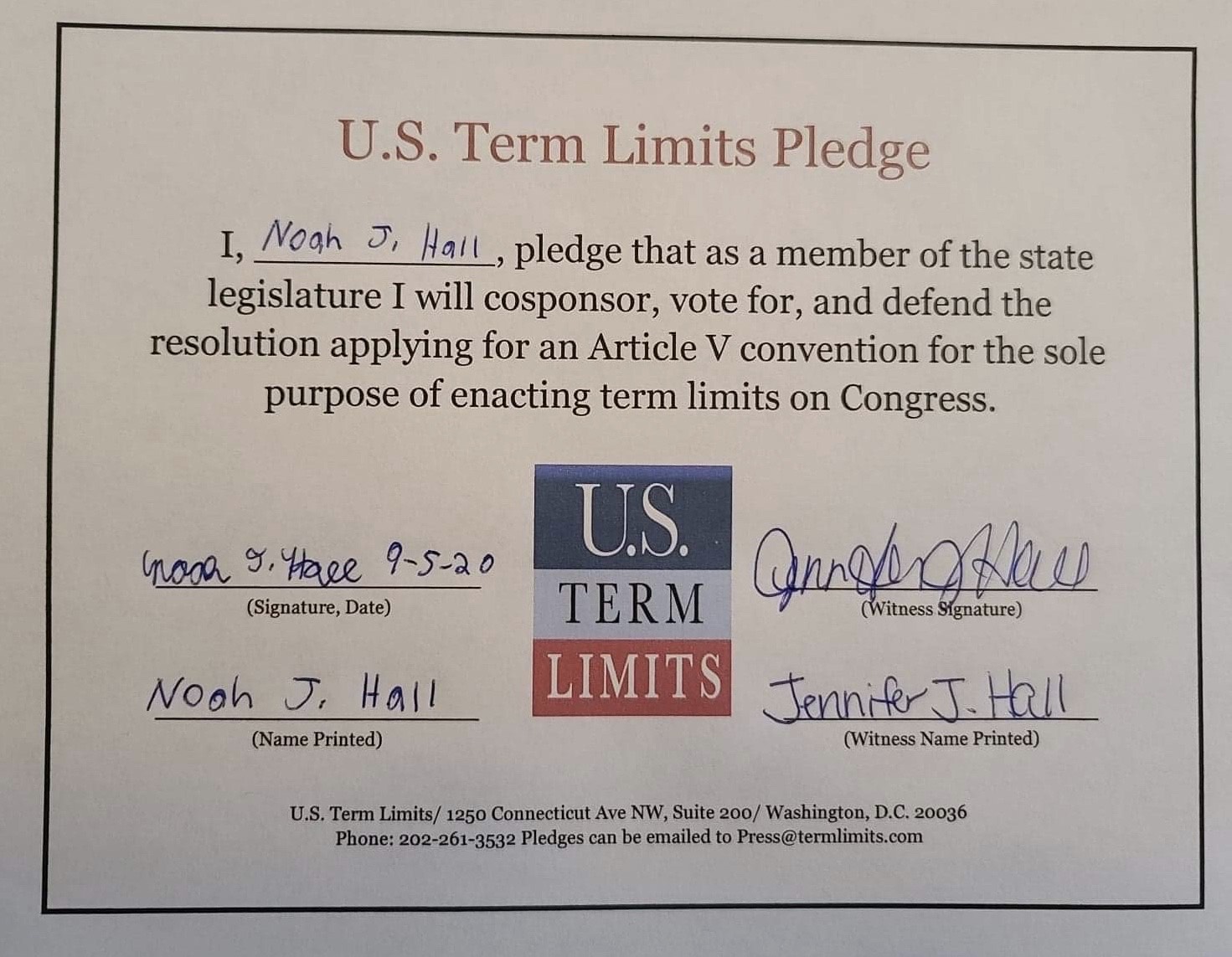 USTL President, Philip Blumel, commented on Hall’s pledge saying, “Noah’s support of term limits shows that there are individuals who are willing to listen to the majority of voters who want term limits. America needs a Congress that will be served by citizen legislators, not career politicians.”