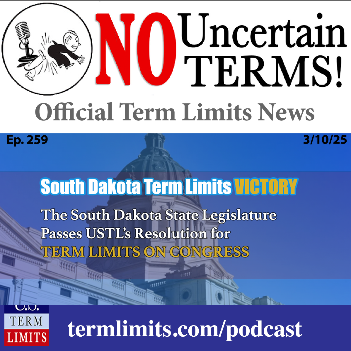 Philip Blumel: South Dakota officially calls for the Term Limits Convention. Boom. Hi, I’m Philip Blumel. Welcome to No Uncertain Terms, the official podcast of the Term Limits movement. This is episode number 259, published on March 10, 2025.