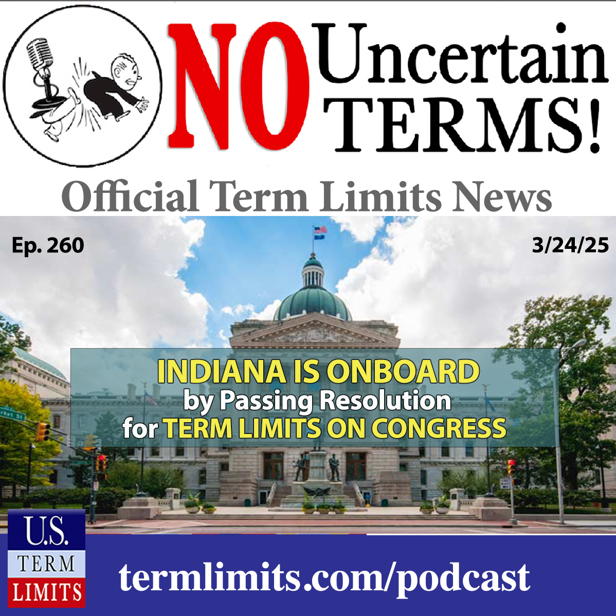Philip Blumel: Indiana. Boom. Eleven states have now officially called for congressional term limits. Hi, I’m Philip Blumel. Welcome to No Uncertain Terms, the official podcast of the term limits movement. This is episode number 260, published on March 24th, 2025.