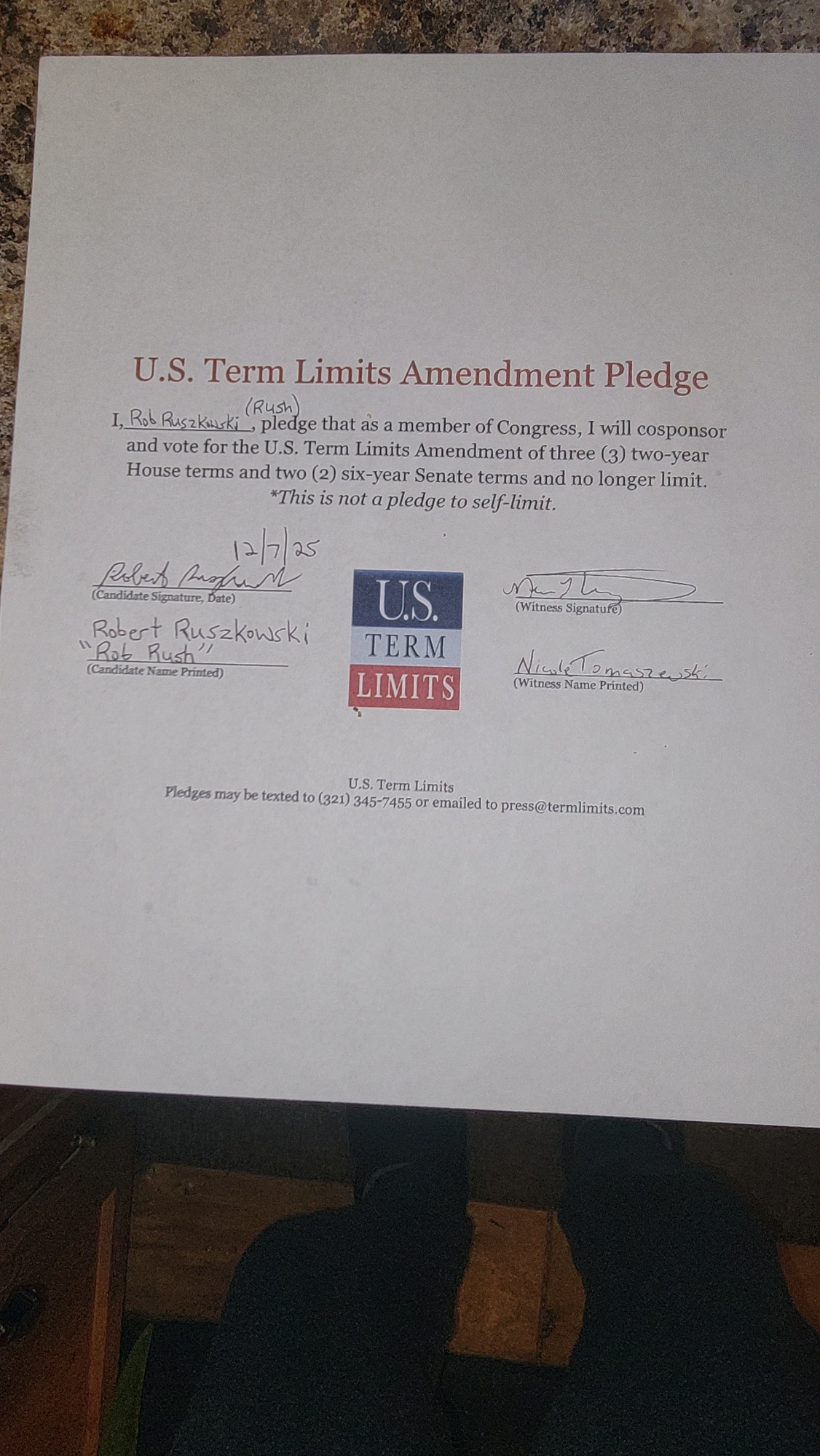 The U.S. Term Limits amendment pledge is provided to every announced candidate for federal office. It reads, “I pledge that as a member of Congress, I will cosponsor and vote for the U.S. Term Limits amendment of three (3) two-year House terms and two (2) six-year Senate terms and no longer limit.”