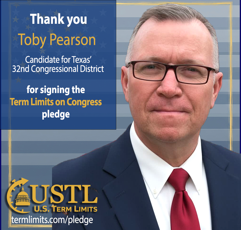 Washington D.C. – U.S. Term Limits (USTL), the leader in the non-partisan national movement to limit terms for elected officials, praises 2026 U.S. House of Representatives candidate for Texas, Tobey Pearson (district 32), for signing the pledge for an amendment to term limit Congress. Previously, candidates Anthony Bridges, Darrell Day and Aimee Carrasco also signed the pledge.