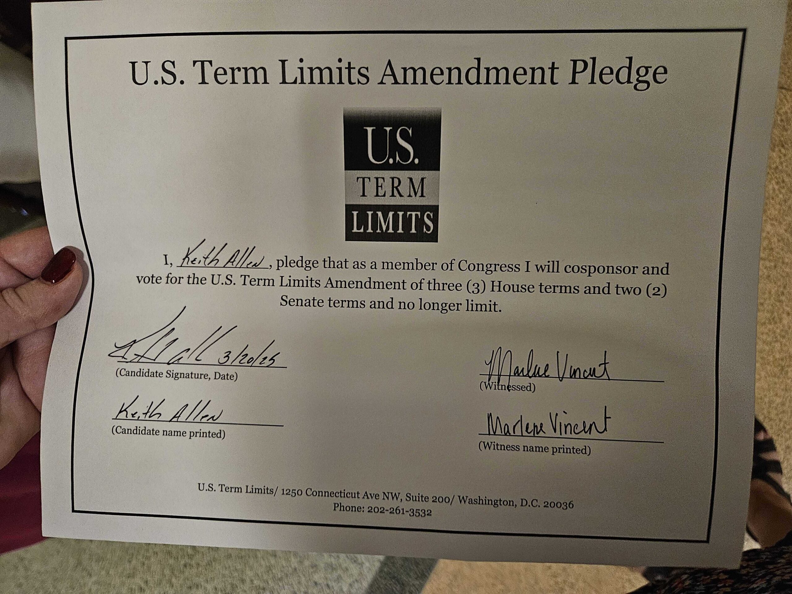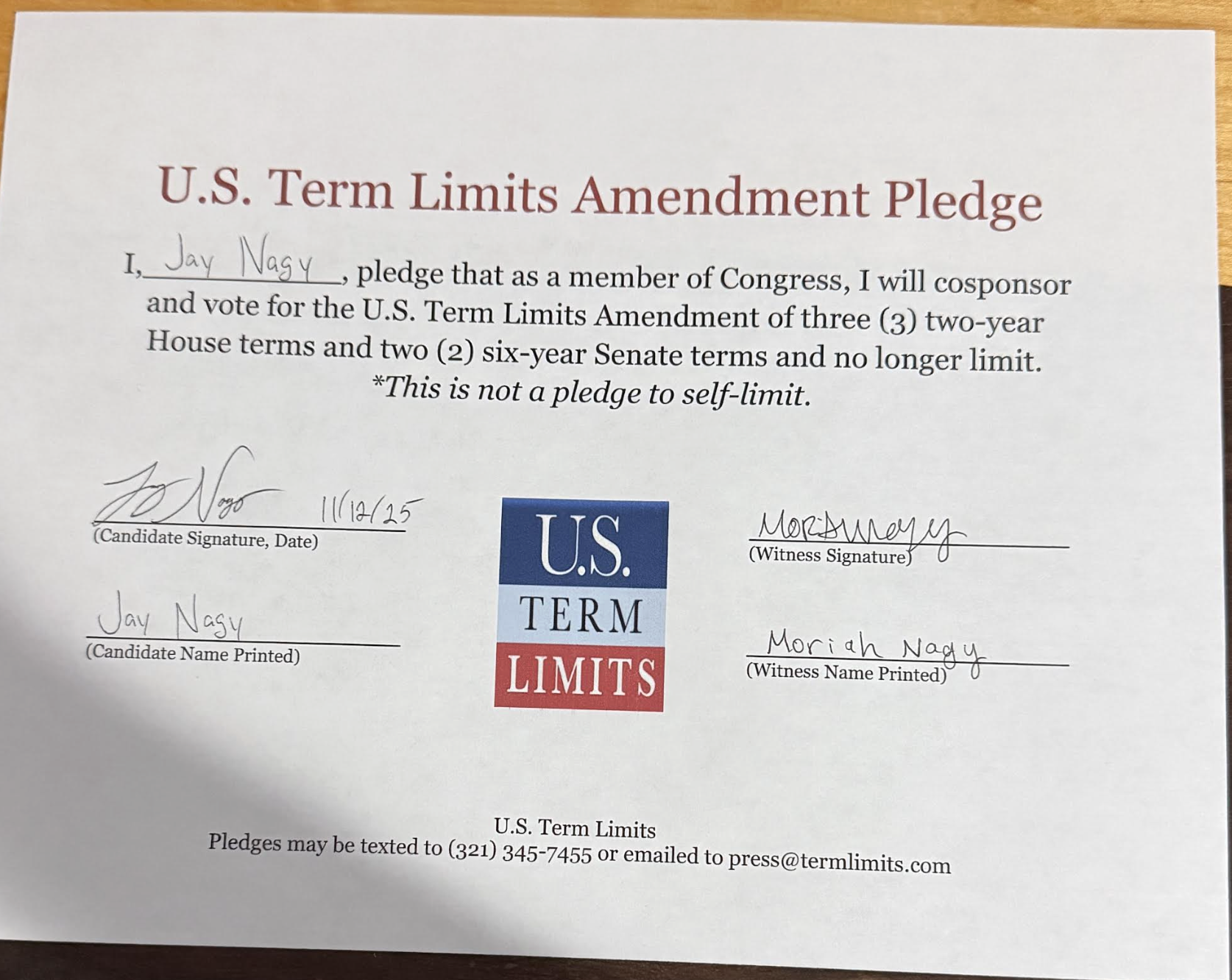 The U.S. Term Limits amendment pledge is provided to every announced candidate for federal office. It reads, “I pledge that as a member of Congress, I will cosponsor and vote for the U.S. Term Limits amendment of three (3) two-year House terms and two (2) six-year Senate terms and no longer limit.”