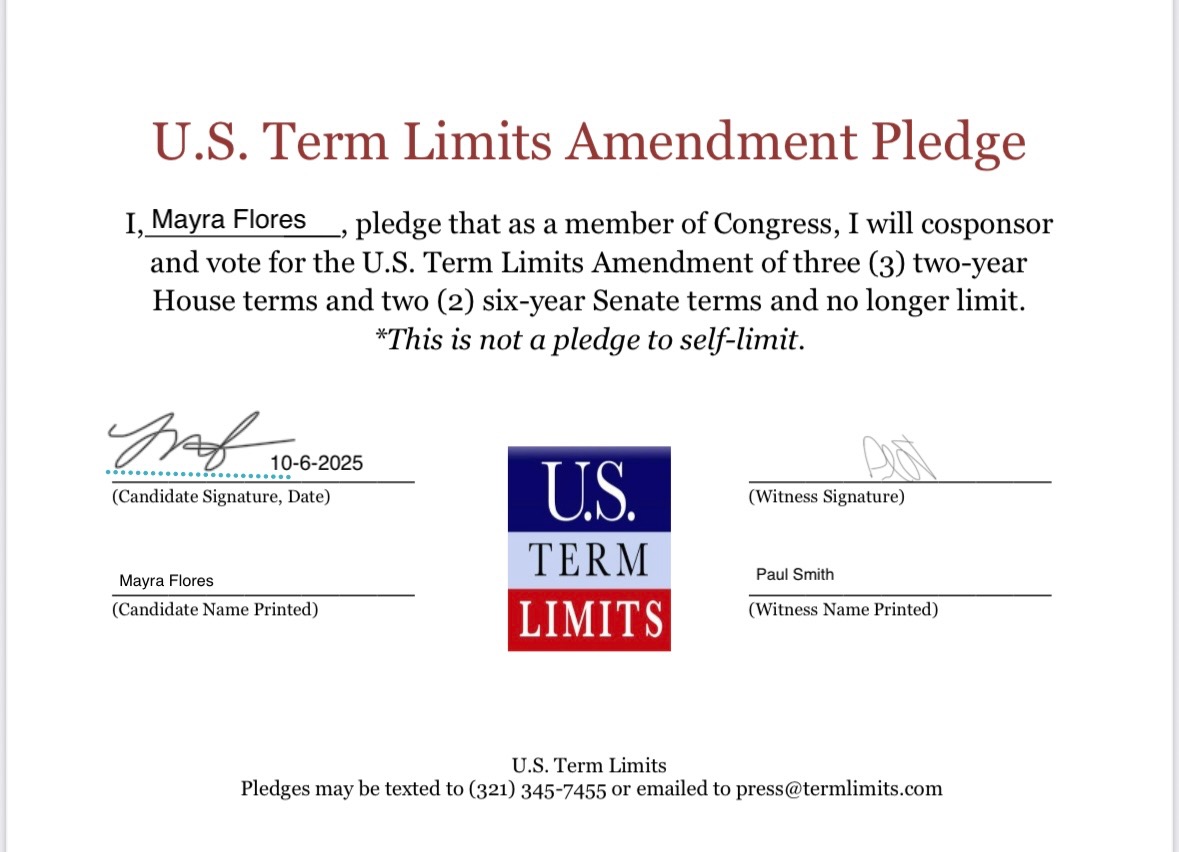 Washington D.C. – U.S. Term Limits (USTL), the leader in the non-partisan national movement to limit terms for elected officials, praises 2026 U.S. House candidate for Texas, Eric Flores (District 34), for signing the pledge for an amendment to term limit Congress. Previously, candidates Jay Nagy, Mayra Flores and Keith Allen also signed the pledge.