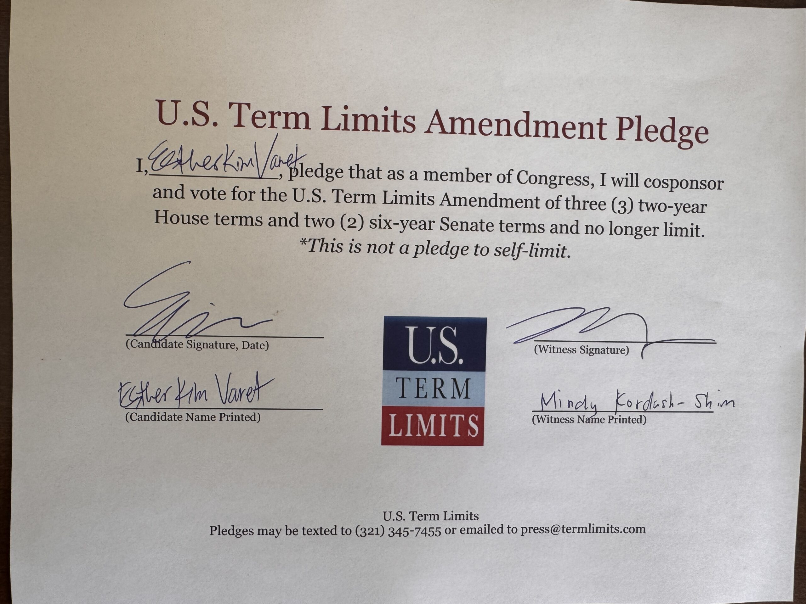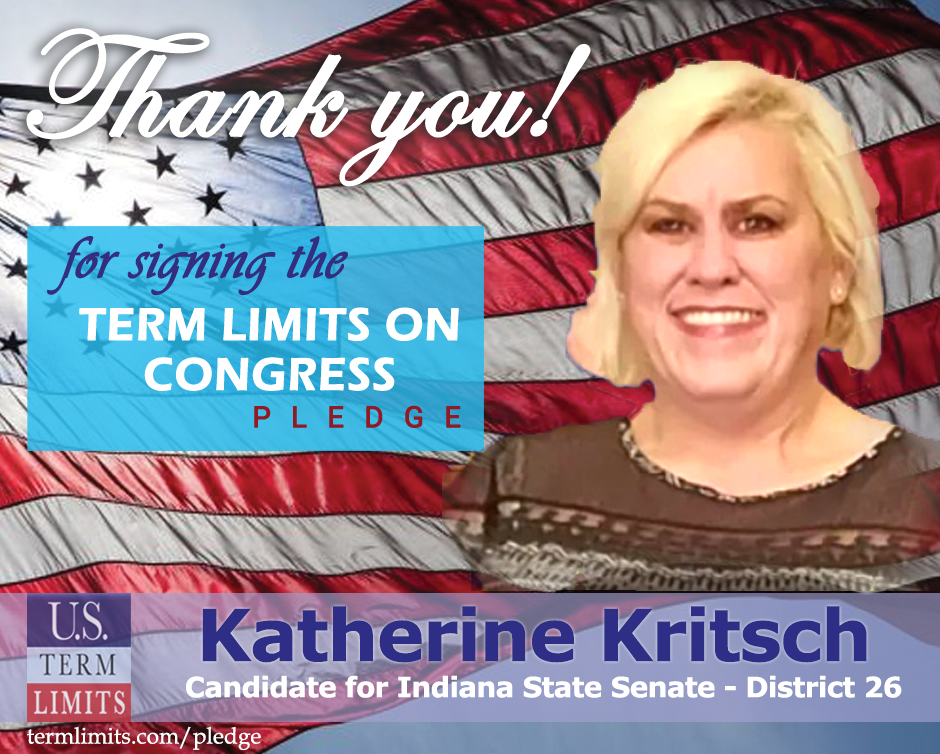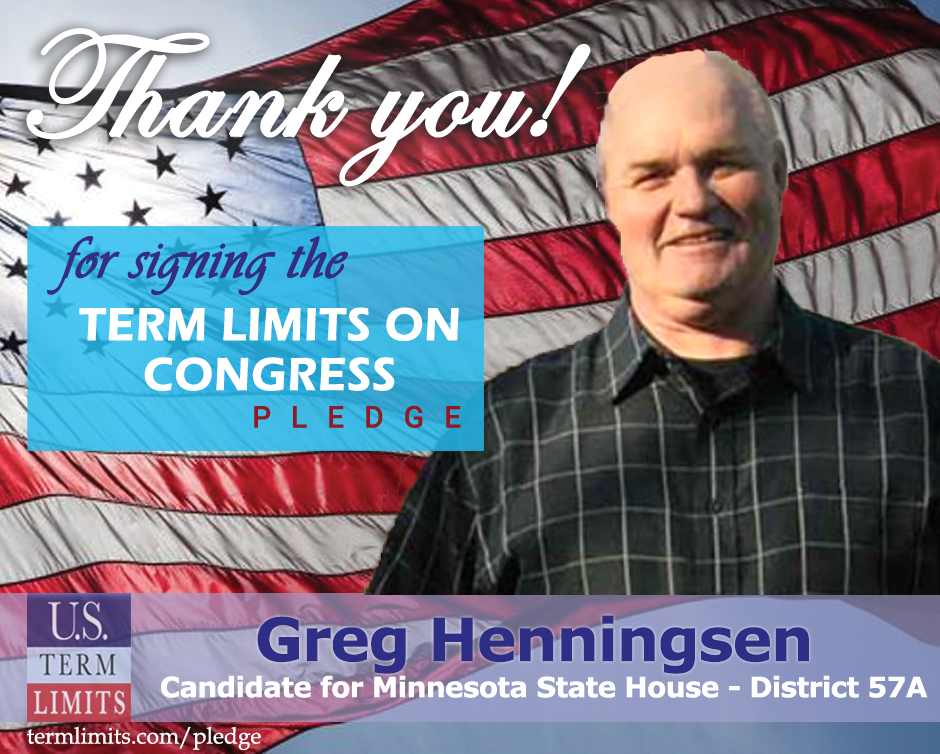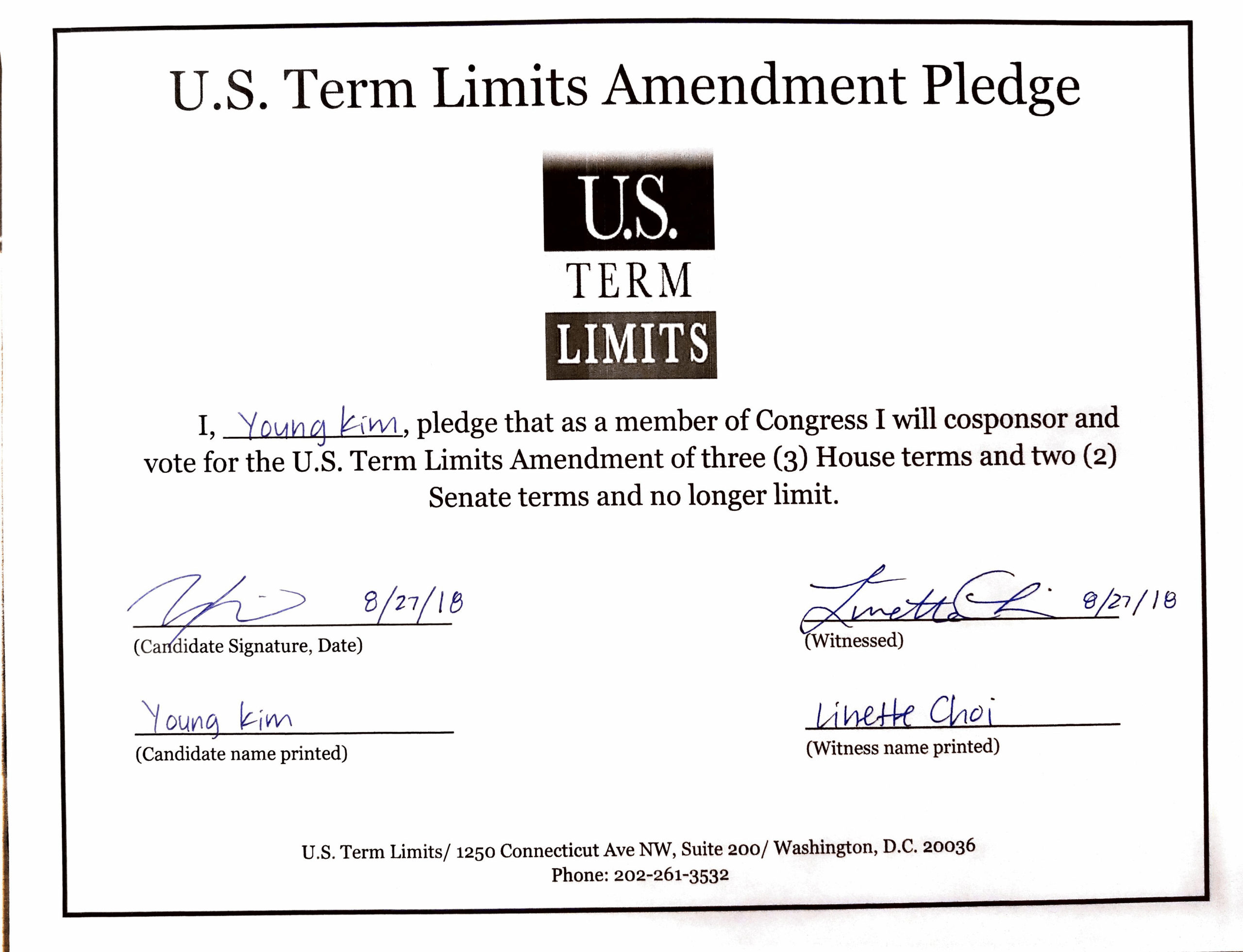 The U.S. Term Limits amendment pledge is provided to every announced candidate for federal office. It reads, “I pledge that as a member of Congress, I will cosponsor and vote for the U.S. Term Limits amendment of three (3) two-year House terms and two (2) six-year Senate terms and no longer limit.”