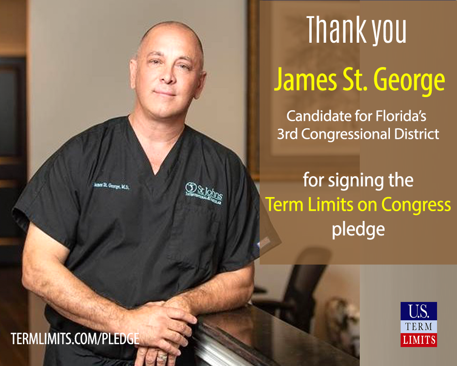 Gainesville, Florida – U.S. Term Limits (USTL), the leader in the non-partisan national movement to limit terms for elected officials, praises 2020 U.S. House candidate for Florida, James St. George (district 3), for signing the pledge for an amendment to term limit Congress. Previously, candidates Kat Cammack, Todd Chase and Gavin Rollins also signed the pledge. The primary election for FL CD-03 is scheduled for August 18, 2020.