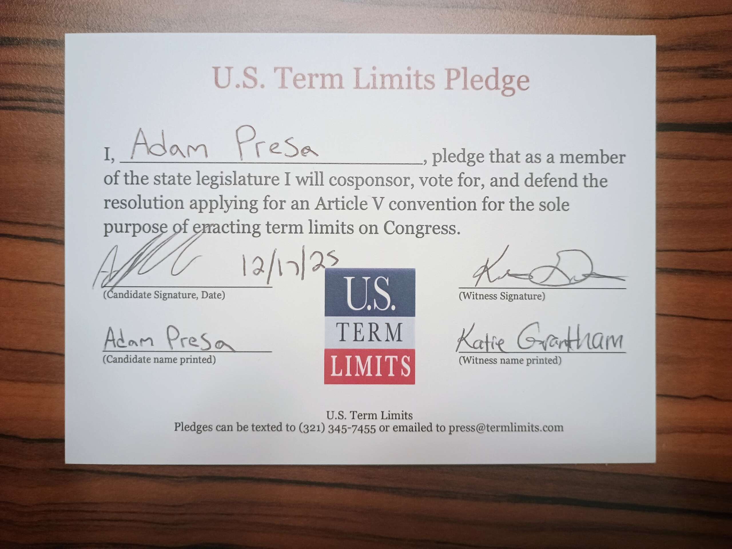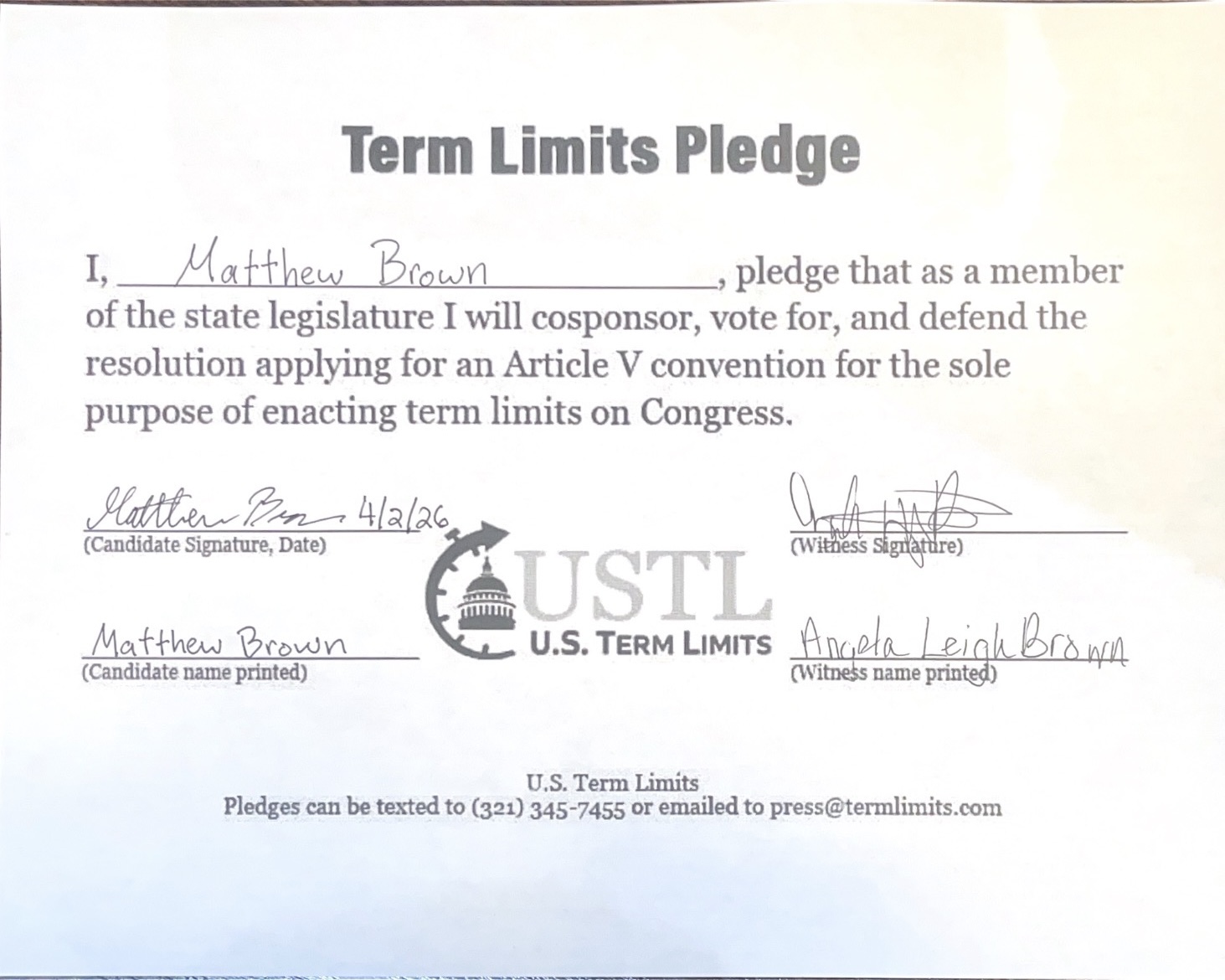 Merrimack, NH – U.S. Term Limits (USTL), the leader in the national, non-partisan movement to limit terms for elected officials, is gathering support from state lawmakers across the nation. Its mission is to get 34 states to apply for an amendment proposal convention specific to term limits on Congress. 2026 New Hampshire state house candidate, Matthew Brown (Hillsborough 12), has committed support for term limits on Congress by signing the term limits convention pledge. Previously, incumbents Julie Miles, Adam Presa, and Bill Boyd also signed the pledge.