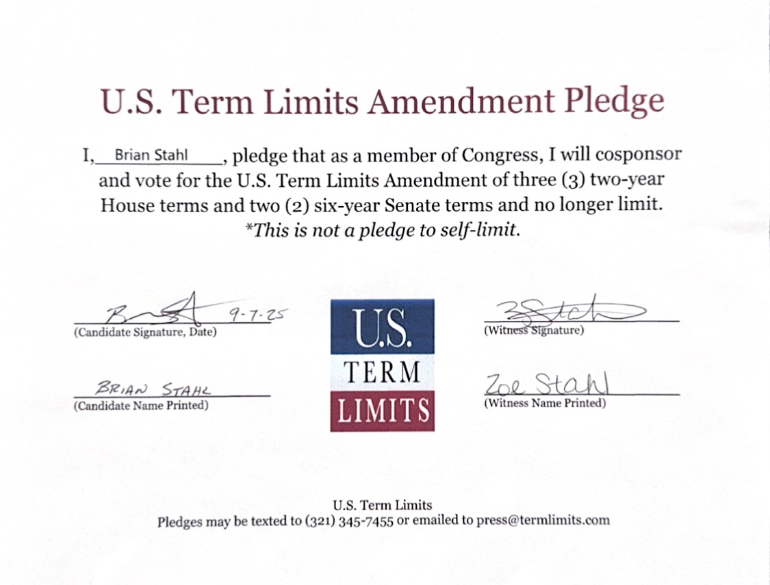The U.S. Term Limits amendment pledge is provided to every announced candidate for federal office. It reads, “I pledge that as a member of Congress, I will cosponsor and vote for the U.S. Term Limits amendment of three (3) two-year House terms and two (2) six-year Senate terms and no longer limit.”