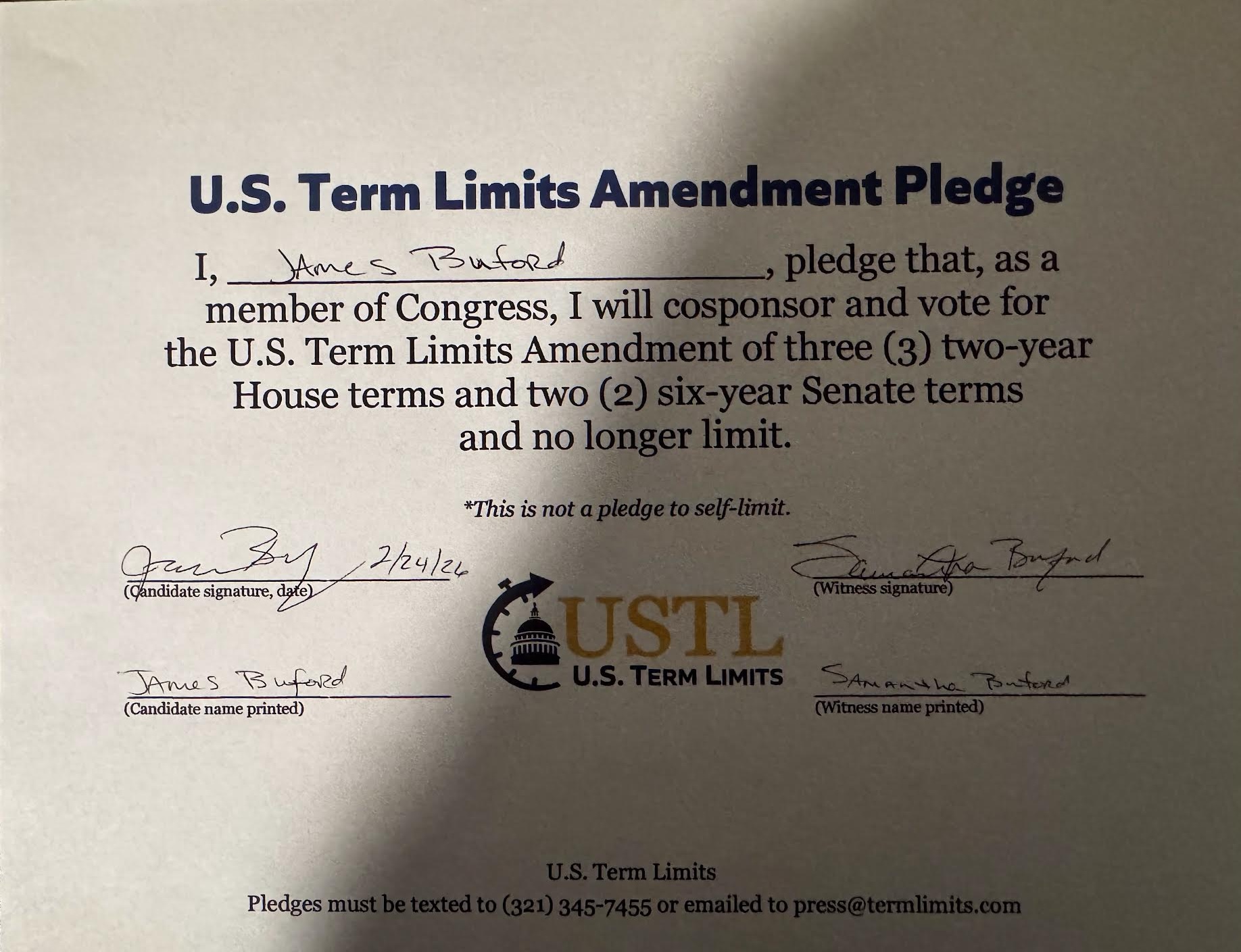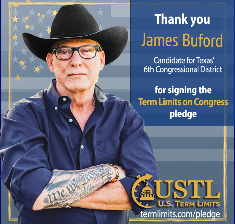 Washington D.C. – U.S. Term Limits (USTL), the leader in the non-partisan national movement to limit terms for elected officials, praises 2026 U.S. Representative candidate for Texas, James Buford (district 6), for signing the pledge for an amendment to term limit Congress. Previously, candidate Brian Stahl and Danny Minton and incumbent Rep. Jake Ellzey also signed the pledge.