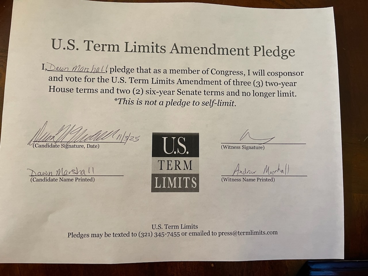 Washington D.C. – U.S. Term Limits (USTL), the leader in the non-partisan national movement to limit terms for elected officials, praises 2026 U.S. House of Representatives candidate for Texas, Dawn Marshall (district 10), for signing the pledge for an amendment to term limit Congress. Previously, candidates Jessica Karlsruher, Chris Gober, and Carl Segan also signed the pledge.