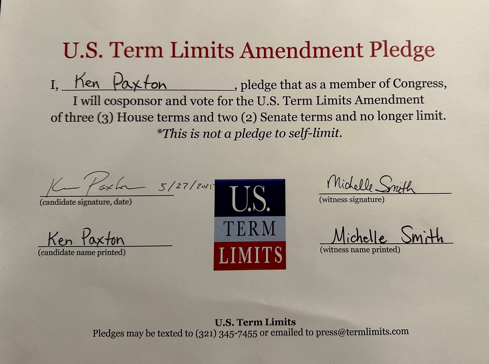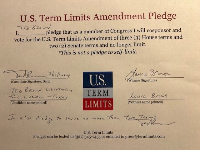 The U.S. Term Limits amendment pledge is provided to every announced candidate for federal office. It reads, “I pledge that as a member of Congress, I will cosponsor and vote for the U.S. Term Limits amendment of three (3) two-year House terms and two (2) six-year Senate terms and no longer limit.”