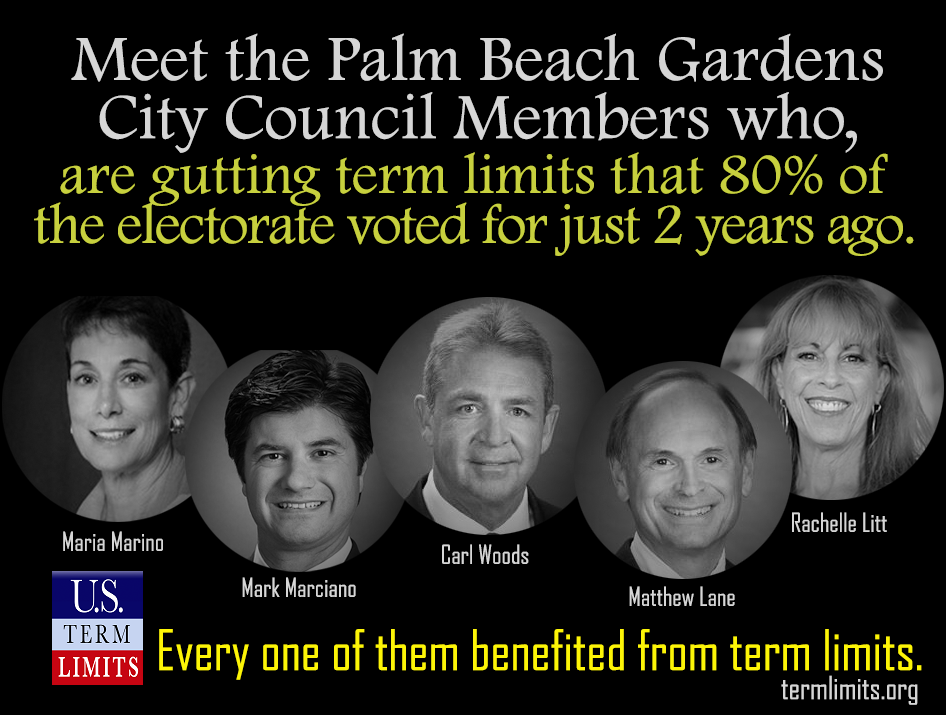 U.S. Term Limits President Philip Blumel and I attended the meeting to testify against this mischief. In all our years of working on term limits – across hundreds of cities, counties and states combined – these Palm Beach Gardens politicians showed us two things we hadn’t seen with such intensity before:
