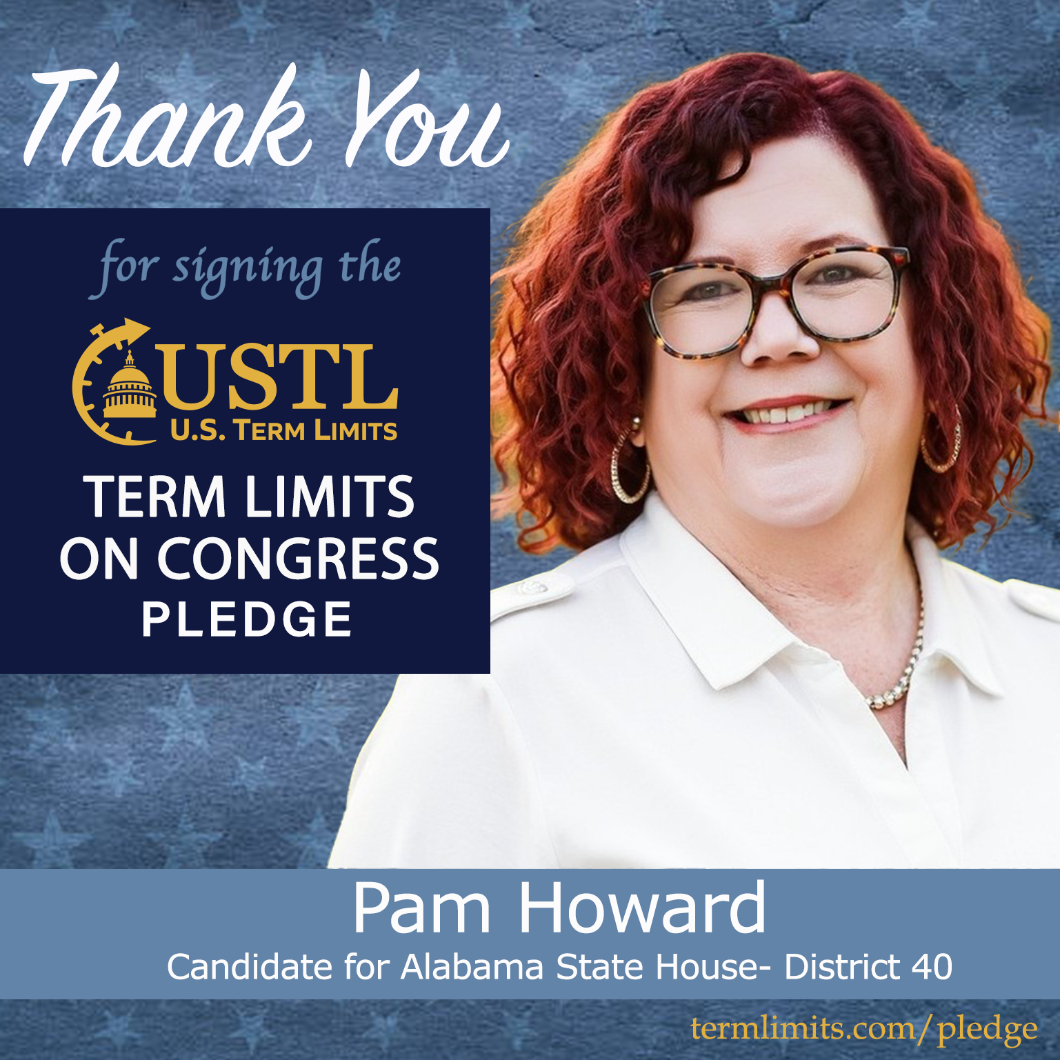 Heflin, AL – U.S. Term Limits (USTL), the leader in the national, non-partisan movement to limit terms for elected officials, is gathering support from state lawmakers across the nation. Its mission is to get 34 states to apply for an amendment proposal convention specific to term limits on Congress. 2026 Alabama state house candidate, Pam Howard (district 40), has committed support for term limits on Congress by signing the term limits convention pledge.