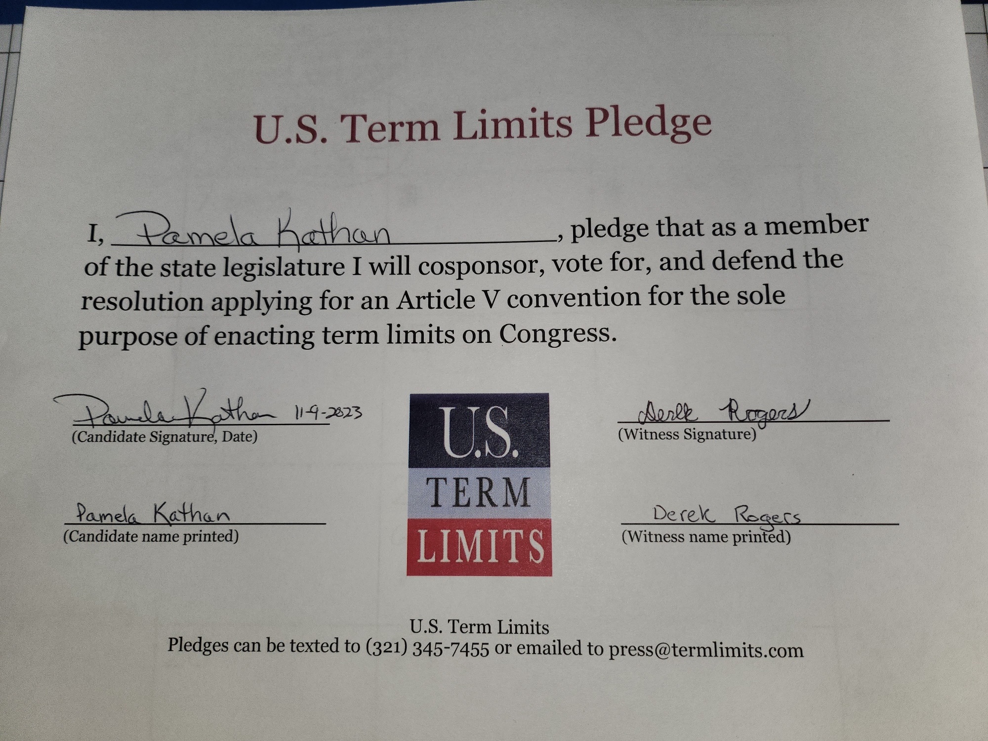 Pamela Kathan Pledges to Support Congressional Term Limits