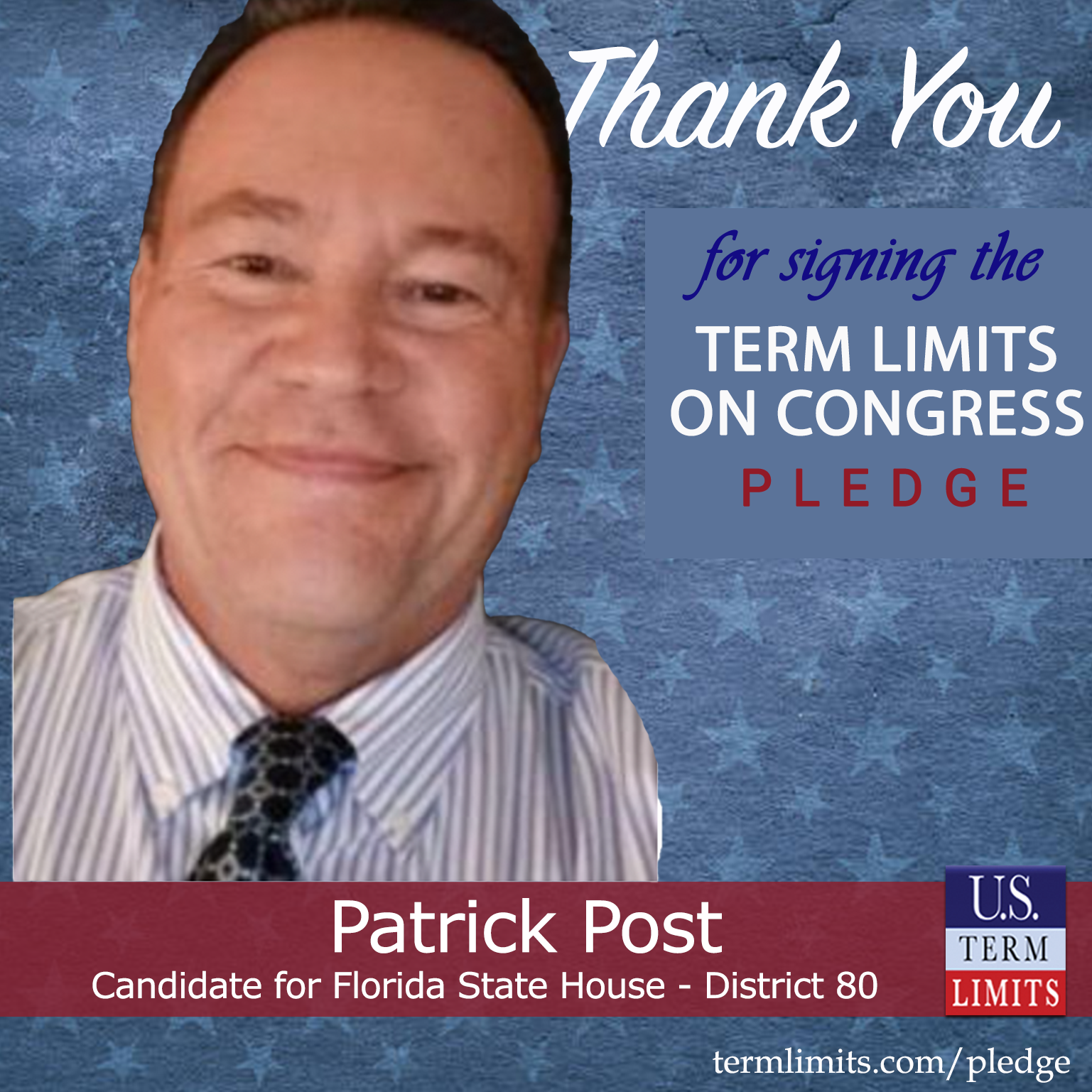 Bonita Springs, FL – U.S. Term Limits (USTL), the leader in the national, non-partisan movement to limit terms for elected officials, is gathering support from state lawmakers across the nation. Its mission is to get 34 states to apply for an amendment proposal convention specific to term limits on Congress. Florida state house candidate, Patrick Post (district 80), has committed support for term limits on Congress by signing the term limits convention pledge. He is the first signer in this race.