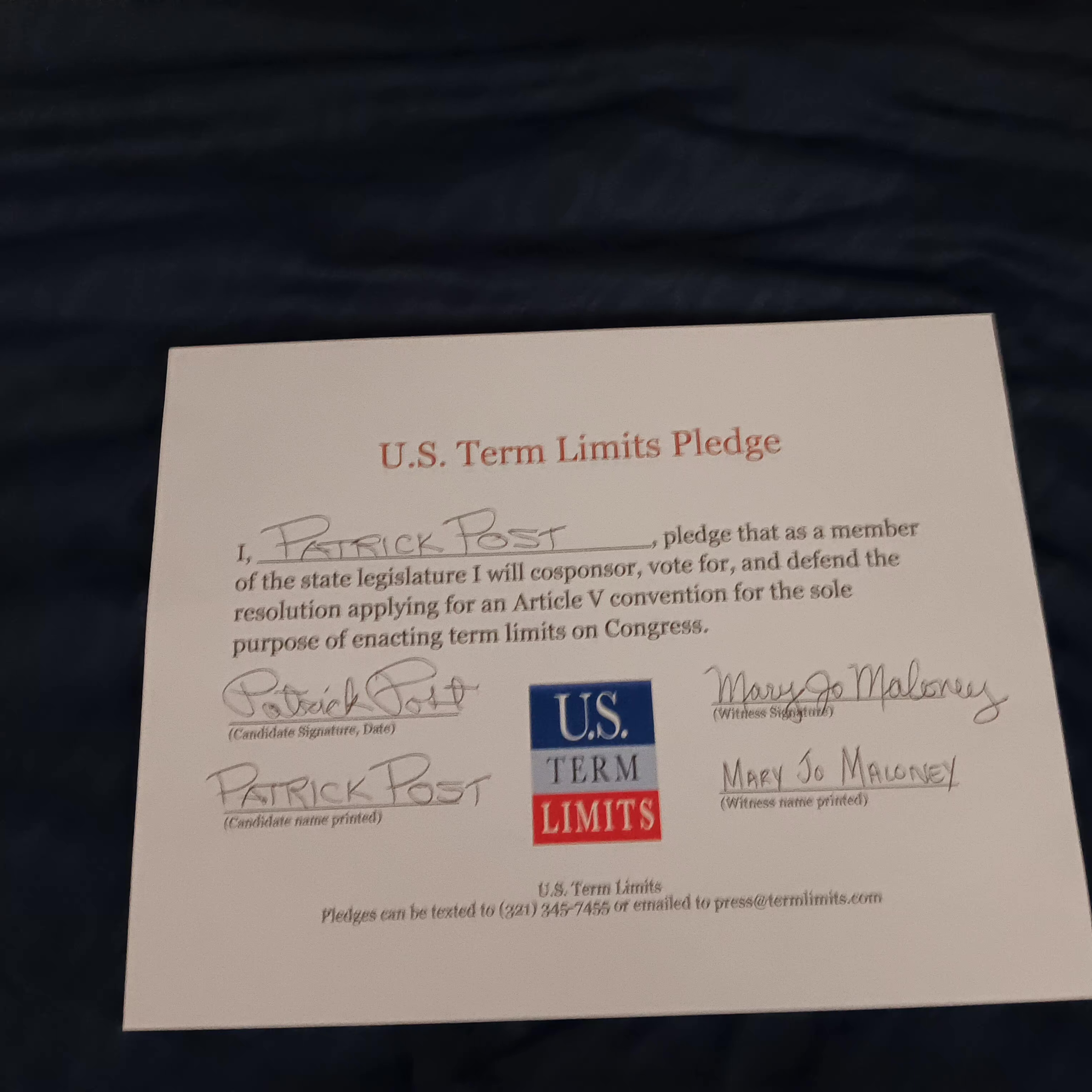 USTL President, Philip Blumel, commented on Post’s pledge saying, “Patrick’s strong support of term limits shows that there are individuals who are willing to listen to the majority of voters who want term limits. America needs a Congress that will be served by citizen legislators, not career politicians.”